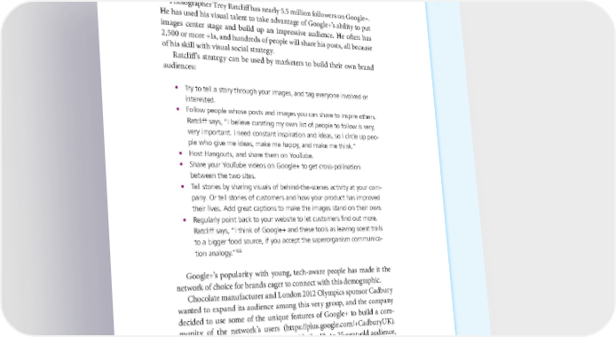 THE POWER OF THE PLATFORM: VISUAL STORYTELLING ON SOCIAL NETWORKS 121 Photographer Trey Ratcliff has nearly 5.5 million followers on Google+. He has used his visual talent to take advantage of Google+’s ability to put images center stage and build up an impressive audience. He often has 2,500 or more +1s, and hundreds of people will share his posts, all because of his skill with visual social strategy. Ratcliff’s strategy can be used by marketers to build their own brand audiences: • Try to tell a story through your images, and tag everyone involved or interested. • Follow people whose posts and images you can share to inspire others. Ratcliff says, “I believe curating my own list of people to follow is very, very important. I need constant inspiration and ideas, so I circle up peo- ple who give me ideas, make me happy, and make me think.” • Host Hangouts, and share them on YouTube. • Share your YouTube videos on Google+ to get cross-pollination between the two sites. • Tell stories by sharing visuals of behind-the-scenes activity at your com- pany. Or tell stories of customers and how your product has improved their lives. Add great captions to make the images stand on their own. • Regularly point back to your website to let customers find out more. Ratcliff says, “I think of Google+ and these tools as leaving scent trails to a bigger food source, if you accept the superorganism communica- 166 tion analogy.” Google+’s popularity with young, tech-aware people has made it the network of choice for brands eager to connect with this demographic. Chocolate manufacturer and London 2012 Olympics sponsor Cadbury wanted to expand its audience among this very group, and the company decided to use some of the unique features of Google+ to build a com- munity of the network’s users (https://plus.google.com/+CadburyUK). The company’s goals were to engage with the 18- to 25-year-old audience,