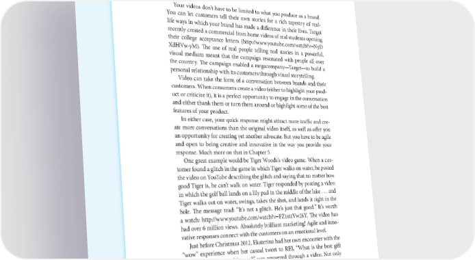 74 THE POWER OF VISUAL STORYTELLING Your videos don’t have to be limited to what you produce as a brand. You can let customers tell their own stories for a rich tapestry of real- life ways in which your brand has made a difference in their lives. Target recently created a commercial from home videos of real students opening their college acceptance letters (http://www.youtube.com/watch?v=NyD XdHVw-yM). The use of real people telling real stories in a powerful, visual medium meant that the campaign resonated with people all over the country. The campaign enabled a megacompany—Target—to build a personal relationship with its customers through visual storytelling. Video can take the form of a conversation between brands and their customers. When consumers create a video (either to highlight your prod- uct or criticize it), it is a perfect opportunity to engage in the conversation and either thank them or turn them around or highlight some of the best features of your product. In either case, your quick response might attract more traffic and cre- ate more conversations than the original video itself, as well as offer you an opportunity for creating yet another advocate. But you have to be agile and open to being creative and innovative in the way you provide your response. Much more on that in Chapter 5. One great example would be Tiger Woods’s video game. When a cus- tomer found a glitch in the game in which Tiger walks on water, he posted the video on YouTube describing the glitch and saying that no matter how good Tiger is, he can’t walk on water. Tiger responded by posting a video in which the golf ball lands on a lily pad in the middle of the lake . . . and Tiger walks out on water, swings, takes the shot, and lands it right in the hole. The message read: “It’s not a glitch. He’s just that good.” It’s worth a watch: http://www.youtube.com/watch?v=FZ1st1Vw2kY. The video has had over 6 million views. Absolutely brilliant marketing! Agile and inno- vative responses connect with the customers on an emotional level. Just before Christmas 2012, Ekaterina had her own encounter with the “wow” experience when her casual tweet to REI, “What is the best gift suggestion you have this year?” was answered through a video. Not only was the video custom made for Ekaterina, it was made within 30 minutes.