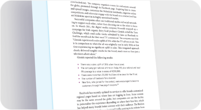 82 THE POWER OF VISUAL STORYTELLING .com/moleskine). The company organizes events for enthusiasts around the globe, promoted through its Facebook page. Inspiring fans to create and spread images, customize the Moleskine notebooks, organize online competitions, and otherwise engage with the brand on a creative level has set Moleskine apart in its highly specialized market. Successful companies often use traditional media and social network- ing to support each other, rather than choosing one or the other to focus on. In March 2011, the digital media company Neworld wrapped up a campaign for Irish organic dairy food producer Glenisk called the Tune Challenge, which used audio tracks submitted by fans on Facebook to find the soundtrack for their next TV commercial. The company says that “Glenisk experienced a sales uplift of 35% while the TV ad was on air. This is in comparison to when the ad was originally run in early 2010, at that time experiencing no significant uplift in sales. This integrated approach clearly delivered tangible results for the brand, much more so than just a television advert alone.” Glenisk reported the following results: • There was a sales uplift of 35% when the ad aired. • The company got national airtime on Today FM, plus national and local PR coverage to a value in excess of 200,000. • There were more than 25,000 YouTube online views for the TV ad. • The number of Facebook fans doubled. • New fans, who joined for the contest, were encouraged to become 69 customers through free yogurt coupons. Facebook has recently updated its services to offer brands customized regional pages based on where fans are logging in from. Some content may be the same around the globe, but companies can use the facility to personalize the experience depending on where their fans live, which has helped many brands better connect with their audience. The Harlem Globetrotters basketball team increased traffic coming to its website from Facebook by 230% with a regionally targeted social media campaign,