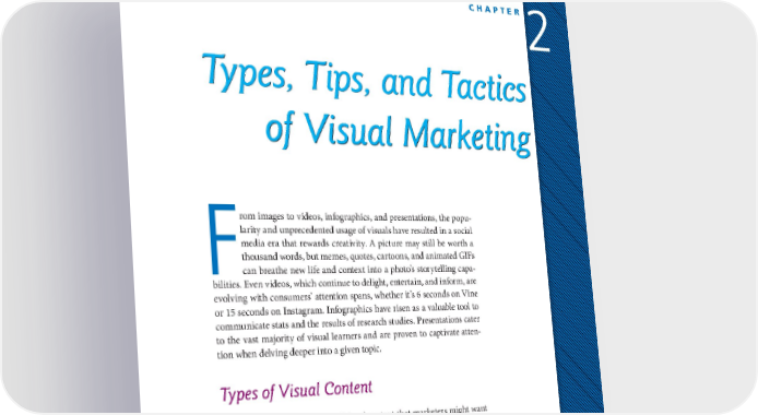 CHAPTER2 Types, Tips, and Tactics of Visual Marketing rom images to videos, infographics, and presentations, the popu- larity and unprecedented usage of visuals have resulted in a social media era that rewards creativity. A picture may still be worth a thousand words, but memes, quotes, cartoons, and animated GIFs Fcan breathe new life and context into a photo’s storytelling capa- bilities. Even videos, which continue to delight, entertain, and inform, are evolving with consumers’ attention spans, whether it’s 6 seconds on Vine or 15 seconds on Instagram. Infographics have risen as a valuable tool to communicate stats and the results of research studies. Presentations cater to the vast majority of visual learners and are proven to captivate atten- tion when delving deeper into a given topic. Types of Visual Content What follows are some types of visual content that marketers might want to pay attention to. 23