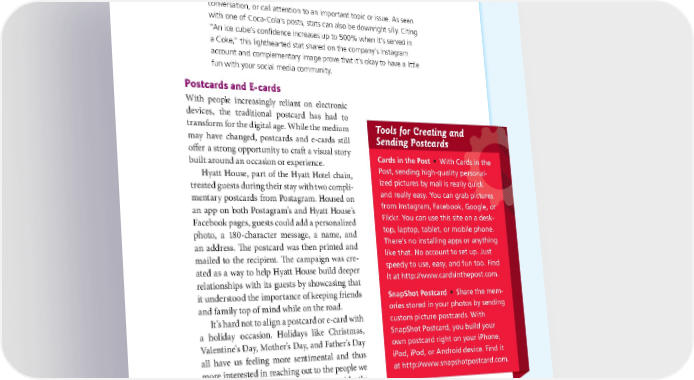 DEVELOPING A VISUAL STORYTELLING ROAD MAP: FROM STRATEGY TO IMPLEMENTATION 157 conversation, or call attention to an important topic or issue. As seen with one of Coca-Cola’s posts, stats can also be downright silly. Citing “An ice cube’s confidence increases up to 500% when it’s served in a Coke,” this lighthearted stat shared on the company’s Instagram account and complementary image prove that it’s okay to have a little fun with your social media community. Postcards and E-cards With people increasingly reliant on electronic devices, the traditional postcard has had to transform for the digital age. While the medium Tools for Creating and may have changed, postcards and e-cards still Sending Postcards offer a strong opportunity to craft a visual story Cards in the Post • With Cardrds ins in the built around an occasion or experience. ersona Hyatt House, part of the Hyatt Hotel chain, Post, sending high-quality personal- quick treated guests during their stay with two compli- ized pictures by mail is really quick ctures mentary postcards from Postagram. Housed on and really easy. You can grab pictures or an app on both Postagram’s and Hyatt House’s from Instagram, Facebook, Google, or Facebook pages, guests could add a personalized Flickr. You can use this site on a desk- photo, a 180-character message, a name, and top, laptop, tablet, or mobile phone. an address. The postcard was then printed and There’s no installing apps or anything mailed to the recipient. The campaign was cre- like that. No account to set up. Just ated as a way to help Hyatt House build deeper speedy to use, easy, and fun too. Find relationships with its guests by showcasing that it at http://www.cardsinthepost.com. it understood the importance of keeping friends SnapShot Postcard • Share the mem- and family top of mind while on the road. ories stored in your photos by sending It’s hard not to align a postcard or e-card with custom picture postcards. With a holiday occasion. Holidays like Christmas, SnapShot Postcard, you build your Valentine’s Day, Mother’s Day, and Father’s Day own postcard right on your iPhone, all have us feeling more sentimental and thus iPad, iPod, or Android device. Find it more interested in reaching out to the people we at http://www.snapshotpostcard.com. care about the most. But what if you accidently,