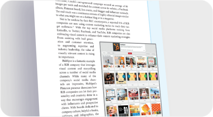 THE RISE OF VISUAL STORYTELLING 19 timeframe, Coach’s user-generated campaign secured an average of 80 images per week and stretched the content across its website, a Facebook album, Pinterest board, live events, and blogger and influencer outreach. The end result was a continuous stream of highly editorial images similar to what you might see on a fashion blog or in a magazine. Not to be outdone by their B2C counterparts, a reported 91% of B2B companies are now using content marketing tactics to reach their tar- 23 get audiences. With the top social media platforms ranking from LinkedIn, to Twitter, Facebook, and YouTube, B2B companies are also embracing visual content to enhance their content marketing strategies. From assisting with lead gener- ation and customer retention, to augmenting expertise and industry leadership, the value of visually relevant content is rising in importance. HubSpot is a fantastic example of a B2B company that leverages visual content and storytelling across a number of social media channels. While many of the company’s social media chan- nels are impressive, HubSpot’s Pinterest presence showcases how B2B companies can let their per- sonality and creativity shine in a way that encourages engagement with influencers and prospective clients. With boards dedicated to company culture, helpful e-books, webinars, and infographics, the visual content shared is a mix of informative, humorous and