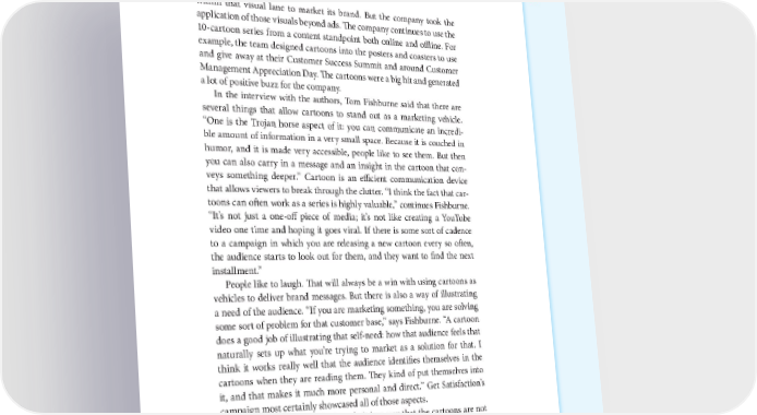 TYPES, TIPS, AND TACTICS OF VISUAL MARKETING 31 within that visual lane to market its brand. But the company took the application of those visuals beyond ads. The company continues to use the 10-cartoon series from a content standpoint both online and offline. For example, the team designed cartoons into the posters and coasters to use and give away at their Customer Success Summit and around Customer Management Appreciation Day. The cartoons were a big hit and generated a lot of positive buzz for the company. In the interview with the authors, Tom Fishburne said that there are several things that allow cartoons to stand out as a marketing vehicle. “One is the Trojan horse aspect of it: you can communicate an incredi- ble amount of information in a very small space. Because it is couched in humor, and it is made very accessible, people like to see them. But then you can also carry in a message and an insight in the cartoon that con- veys something deeper.” Cartoon is an efficient communication device that allows viewers to break through the clutter. “I think the fact that car- toons can often work as a series is highly valuable,” continues Fishburne. “It’s not just a one-off piece of media; it’s not like creating a YouTube video one time and hoping it goes viral. If there is some sort of cadence to a campaign in which you are releasing a new cartoon every so often, the audience starts to look out for them, and they want to find the next installment.” People like to laugh. That will always be a win with using cartoons as vehicles to deliver brand messages. But there is also a way of illustrating a need of the audience. “If you are marketing something, you are solving some sort of problem for that customer base,” says Fishburne. “A cartoon does a good job of illustrating that self-need: how that audience feels that naturally sets up what you’re trying to market as a solution for that. I think it works really well that the audience identifies themselves in the cartoons when they are reading them. They kind of put themselves into it, and that makes it much more personal and direct.” Get Satisfaction’s campaign most certainly showcased all of those aspects. The challenge, obviously, is to do it in a way that the cartoons are not seen as infomercials, but instead as valuable pieces of content that people