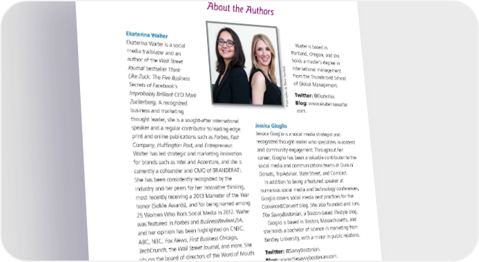About the Authors Ekaterina Walter Walter is based in Ekaterina Walter is a social Portland, Oregon, and she media trailblazer and an holds a master’s degree in d d author of the Wall Street l international management e fiel fi r Journal bestseller Think a from the Thunderbird School Gar e e G v e e Like Zuck: The Five Business t of Global Management. St b Secrets of Facebooks n by S e en k Twitter: @Ekaterina. a Improbably Brilliant CEO Mark tak o t to oto Blog: www.ekaterinawalter h Zuckerberg. A recognized PPh business and marketing .com. thought leader, she is a sought-after international Jessica Gioglio speaker and a regular contributor to leading-edge Jessica Gioglio is a social media strategist and print and online publications such as Forbes, Fast recognized thought leader who specializes in content Company, Huffington Post, and Entrepreneur. and community engagement. Throughout her Walter has led strategic and marketing innovation career, Gioglio has been a valuable contributor to the for brands such as Intel and Accenture, and she is social media and communications teams at Dunkin’ currently a cofounder and CMO of BRANDERATI. Donuts, TripAdvisor, State Street, and Comcast. She has been consistently recognized by the In addition to being a featured speaker at industry and her peers for her innovative thinking, numerous social media and technology conferences, most recently receiving a 2013 Marketer of the Year Gioglio covers social media best practices for the honor (SoMe Awards), and for being named among Convince&Convert blog. She also founded and runs 25 Women Who Rock Social Media in 2012. Walter The SavvyBostonian, a Boston-based lifestyle blog. was featured in Forbes and BusinessReviewUSA, Gioglio is based in Boston, Massachusetts, and and her opinion has been highlighted on CNBC, she holds a bachelor of science in marketing from ABC, NBC, Fox News, First Business Chicago, Bentley University, with a minor in public relations. TechCrunch, the Wall Street Journal, and more. She sits on the board of directors of the Word of Mouth Twitter: @SavvyBostonian. Marketing Association (WOMMA). Blog: www.thesavvybostonian.com.