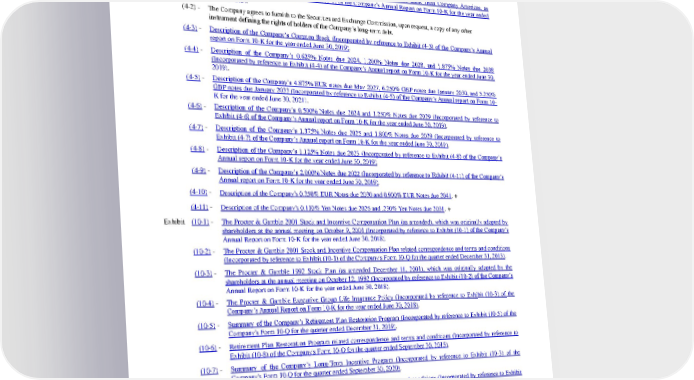 EXHIBIT INDEX Exhibit (3 - 1) - Amended Art icles of Incorporation (as amended by shareholders at the annual meeting on October 11, 2011 and consolidated by the Board of Directors on April 8, 2016) (Incorporated by reference to Exhibit (3 - 1) of the Company's Annual Report on Form 10 - K for the year e nded June 30, 2016) . (3 - 2) - Regulations (as approved by the Board of Directors on April 8, 2016, pursuant to authority granted by shareholders at the annual meeting on October 13, 2 009) (Incorporated by reference to Exhibit (3 - 2) of the Company's Annual Report on Form 10 - K for the year ended June 30, 2016) . Exhibit (4 - 1) - Indenture, dated as of September 3, 200 9, between the Company and Deutsche Bank Trust Company Americas, as Trustee (Incorporated by reference to Exhibit (4 - 1) of the Company's Annual Report on Form 10 - K for the year ended June 30, 2015) . (4 - 2) - The Company agrees to furnish to the Securities and Exchange Commission, upon request, a copy of any other instrument defining the rights of holders of the Company’s long - term debt. (4 - 3) - Description of the Company’s Common Stock (Incorporated by reference to Exhibit (4 - 3) of the Company’s Annual report on Form 10 - K for the year ended June 30, 2019) . (4 - 4) - Description of the Company’s 0.625% Notes due 2024, 1.200% Notes due 2028, and 1.875% Notes due 2038 (Incorporated by reference to Exhibit (4 - 4) of the C ompany’s Annual report on Form 10 - K for the year ended June 30, 2019) . (4 - 5) - Description of the Company’s 4.875% EUR notes due May 2027, 6.250% GBP notes due January 2030, and 5.250% GBP notes due January 2033 (Incorporated by reference to Exhibit (4 - 5) of the Company’s Annual report on Form 10 - K for the year ended June 30, 2021) . (4 - 6) - Description of the Company’s 0.500% Not es due 2024 and 1.250% Notes due 2029 (Incorporated by reference to Exhibit (4 - 6) of the Company’s Annual report on Form 10 - K for the year ended June 30, 2019) . (4 - 7) - Description of the Company’s 1.375% Not es due 2025 and 1.800% Notes due 2029 (Incorporated by reference to Exhibit (4 - 7) of the Company’s Annual report on Form 10 - K for the year ended June 30, 2019) . (4 - 8) - Description of the Company’s 1.125% Not es due 2023 (Incorporated by reference to Exhibit (4 - 8) of the Company’s Annual report on Form 10 - K for the year ended June 30, 2019) . (4 - 9) - Description of the Company’s 2.000% Notes due 2022 (Incorporated by reference to Exhibit (4 - 11) of the Company’s Annual report on Form 10 - K for the year ended June 30, 2019) . (4 - 10) - Description of the Company 's 0.350% EUR Notes due 2030 and 0.900% EUR Notes due 2041 . + (4 - 11) - Description of the Company 's 0.110% Yen Notes due 2026 and .230% Yen Notes due 2031 . + Exhibit (10 - 1) - The Procter & Gamble 2001 Stock and Incentive Compensation Plan (as amended), which was originally adopted by shareholders at the annual meeting on October 9, 2001 (Incorporated by reference to Exhibit (10 - 1) of the Company’s Annual Report on Form 10 - K for the year ended June 30, 2018) . (10 - 2) - The Procter & Gamble 2001 Stock and Incentive Compensation Plan related correspondence and terms and conditions (Incorporated by reference to Exhibit (10 - 1) of the Company's Form 10 - Q for the quarter ended December 31, 2013) . (10 - 3) - The Procter & Gamble 1992 Stock Plan (as amended December 11, 2001), which was originally adopted by the shareholders at the annual meeting on October 12, 1992 (Incorporated by reference to Exhibit (10 - 2) of the Company’s Annual Report on Form 10 - K for the year ended June 30, 2018) . (10 - 4) - The Procter & Gamble Executive Group Life Insurance Policy (Incorporated by reference to Exhibit (10 - 3) of the Company’s Annual Report on Form 10 - K for the year ended June 30, 2018) . (10 - 5) - Summary of the Company’s Retirem ent Plan Restoration Program (Incorporated by reference to Exhibit (10 - 5) of the Company's Form 10 - Q for the quarter ended December 31, 2019) . (10 - 6) - Retirement Plan Restoratio n Program related correspondence and terms and conditions (Incorporated by reference to Exhibit (10 - 8) of the Company's Form 10 - Q for the quarter ended September 30, 2015) . (10 - 7) - Summary of the Company’s Long - Te rm Incentive Program (Incorporated by reference to Exhibit (10 - 3) of the Company's Form 10 - Q for the quarter ended September 30, 2020) . (10 - 8) - Long - Term Incentive Progra m related correspondence and terms and conditions (Incorporated by reference to Exhibit (10 - 3) of the Company's Form 10 - Q for the quarter ended September 30, 2021) . (10 - 9) - The Procter & Gamble Company Executive Deferred Compensation Plan (Incorporated by reference to Exhibit (10 - 2) of the Company's Form 10 - Q for the quart er ended March 31, 2020) . (10 - 10) - Summary of the Company's Short Term Achievement Reward Program . + (10 - 11) - Short Term Achievement Re ward Program – related correspondence and terms and conditions (Incorporated by reference to Exhibit (10 - 2) of the Company's Form 10 - Q for the quarter ended September 30, 2021) . (10 - 12) - Company's Form of Separation Agreement & Re lease . + The Procter & Gamble Company 69