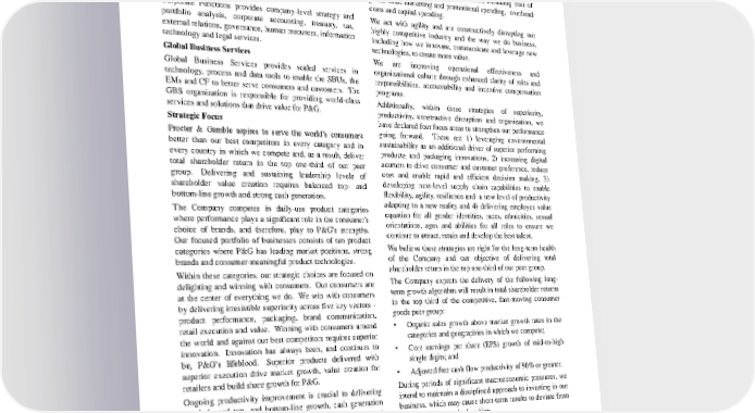 Charmin toilet paper brands. North America market shares are over 40% for Bounty and over 25% for Charmin. Enterprise Markets Enterprise Markets are responsible for sales and profit delivery in specific countries, supported by SBU - agreed innovation a nd supply chain plans, along with scaled services like planning, distribution and customer management. Corporate Functions Corporate Functions provides company - level strategy and portfolio analysis, corporate accounting, treasury, tax, external relations, governance, human resources, information technology and legal services. Global Business Services Global Business Services provides scaled services in technology, process and data tools to enable the SBUs, the EMs and CF to better serve consumers and custom ers. The GBS organization is responsible for providing world - class services and solutions that drive value for P&G. Strategic Focus Procter & Gamble aspires to serve the world’s consumers better than our best competitors in every category and in every cou ntry in which we compete and, as a result, deliver total shareholder return in the top one - third of our peer group. Delivering and sustaining leadership levels of shareholder value creation requires balanced top - and bottom - line growth and strong cash gen eration. The Company competes in daily - use product categories where performance plays a significant role in the consumer's choice of brands, and therefore, play to P&G's strengths. Our focused portfolio of businesses consists of ten product categories whe re P&G has leading market positions, strong brands and consumer - meaningful product technologies. Within these categories, our strategic choices are focused on delighting and winning with consumers. Our consumers are at the center of everything we do. We win with consumers by delivering irresistible superiority across five key vectors - product performance, packaging, brand communication, retail execution and value. Winning with consumers around the world and against our best competitors requires superior innovation. Innovation has always been, and continues to be, P&G’s lifeblood. Superior products delivered with superior execution drive market growth, value creation for retailers and build share growth for P&G. Ongoing productivity improvement is cruci al to delivering our balanced top - and bottom - line growth, cash generation and value creation objectives. Productivity improvement enables investments to strengthen the superiority of our brands via product and packaging innovation, more efficient and eff ective supply chains, equity and awareness - building brand advertising and other programs and expansion of sales coverage and R&D programs. Productivity improvements also enable us to mitigate challenging cost environments (including periods of increasing commodity and negative foreign exchange impacts). Our objective is to drive productivity improvements across all elements of the statement of earnings and balance sheet, including cost of goods sold, marketing and promotional spending, overhead costs and capital spending. We act with agility and are constructively disrupting our highly competitive industry and the way we do business, including how we innovate, communicate and leverage new technologies, to create more value. We are improving operational e ffectiveness and organizational culture through enhanced clarity of roles and responsibilities, accountability and incentive compensation programs. Additionally, within these strategies of superiority, productivity, constructive disruption and organization , we have declared four focus areas to strengthen our performance going forward. These are 1) leveraging environmental sustainability as an additional driver of superior performing products and packaging innovations, 2) increasing digital acumen to drive consumer and customer preference, reduce cost and enable rapid and efficient decision making, 3) developing next - level supply chain capabilities to enable flexibility, agility, resilience and a new level of productivity adapting to a new reality and 4) de livering employee value equation for all gender identities, races, ethnicities, sexual orientations, ages and abilities for all roles to ensure we continue to attract, retain and develop the best talent. We believe these strategies are right for the long - t erm health of the Company and our objective of delivering total shareholder return in the top one - third of our peer group. The Company expects the delivery of the following long - term growth algorithm will result in total shareholder returns in the top thir d of the competitive, fast - moving consumer goods peer group: • Organic sales growth above market growth rates in the categories and geographies in which we compete; • Core earnings per share (EPS) growth of mid - to - high single digits; and • Adjusted free cash flow productivity of 90% or greater. During periods of significant macroeconomic pressures, we intend to maintain a disciplined approach to investing in our business, which may cause short - term results to deviate from the long - term growth algorithm. 16 The Procter & Gamble Company