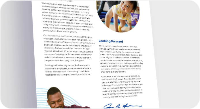 Our Community Impact work helps improve lives for people in difficult times by providing clean water and donations of product, time and money to those affected by natural disasters and crises around the world. It is also part of what employees are proud of and value in P&G. The ability to do good for the communities we live and work in also helps us attract and retain the best talent. We know we increase our chances of winning when we have an equal, diverse and inclusive culture that gives life to the best thoughts and ideas — a culture where everyone can succeed and is able to be their best. Externally, we support equality and inclusion efforts with our business partners and in the communities where we live and work because it is not only the right thing to do, but it also can improve income and wealth equity for more people, creating more purchasing power, which drives market growth. Our foundation is our Purpose, Values and Principles, which set a high standard for each P&G person. High standards are good. They require that we hold ourselves and each other accountable for results and, equally important, for how we achieve those results. Last year, we added an ESG factor to our annual incentive compensation program for our senior executives as a demonstration of our commitment to near-term progress toward our long-term ESG goals. Serving and balancing the needs of consumers, customers, employees, society and shareowners will not be easy, but it is necessary — and those that do it best, as I expect we will, should thrive. Looking Forward The integrated strategies we have outlined here were delivering strong results before the pandemic. They served us well during the more recent volatile times. They remain the right strategic choices to drive balanced growth and value creation. We endeavor to step forward into the challenges we face, not back, growing through near-term challenges, while serving consumers and communities. We are doing this in our interest, in society’s interest and in the interest of our long-term shareowners. Confidence in our future success is rooted in my confidence in P&G people. Every day, P&G people demonstrate their commitment to our Purpose, Values and Principles, their high motivation to win, their personal accountability to winning results, and their strong focus on sustained excellence in everything they do — serving consumers, serving customers and delivering for shareowners. JON R. MOELLER Chairman of the Board, President and Chief Executive Officer viii • The Procter & Gamble Company