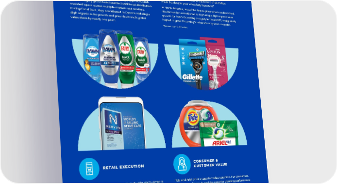 PRODUCT An upgraded formula and unique packaging made Dawn EZ-Squeeze in the U.S. and Fairy Max Power in Europe stand- out products in fiscal 2022. The inverted bottle, no-flip cap and self-sealing valve allow for easy one-handed use of every drop of soap. These products contributed to mid-single digit hand dish global category growth and enabled additional distribution and shelf space across multiple markets and retailers. During fiscal 2022, they contributed to Dawn’s mid-single digit organic sales growth and grew the brand’s global value share by nearly one point. PACKAGING We have now introduced a plastic-free package for many Gillette and Venus products in every P&G region globally. It delights consumers as it is easier to open, read and select at shelf, and fully recyclable. We estimate this superior package could save the plastic equivalent of 85 million water bottles per year when fully launched.* In North America, one of the first regions where we launched, this innovation contributed to high single digit organic sales growth for P&G’s Grooming category in fiscal 2022, and globally helped to grow Grooming’s value share by over one point. *Based on FY20 sales RETAIL EXECUTION Nervive is a nerve care product launched in North America in fiscal 2022, helping to establish the nerve care category in that region after many successful years in Europe with Neurobion, a brand acquired with Merck in 2018. Eye-level brand blocks on-shelf and displays at top retailers grew sales by more than 40% where executed, and strong online content and search strategy supported e-commerce growth. As a result, Nervive contributed to Personal Health Care organic sales growth of 20% in fiscal 2022. CONSUMER & CUSTOMER VALUE Tide and Ariel offer a superior value equation. For consumers, our enhanced formula enables superior cleaning performance in cold water, creating energy savings and avoiding rewashing which may be necessary with less effective detergents. By reducing the energy required to heat water in the laundry process and improving garment life spans, consumers also see sustainability benefits. For customers, innovations like Tide Power PODS help drive category growth. In fiscal 2022, unit dose detergent grew organic sales in the low teens globally, with growth in every region, contributing to P&G’s double digit growth in the Fabric Care category.