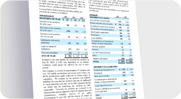 pension obligations recorded in shareholders' equity, pa rtially offset by the tax effects of net investment hedges. Prior to the passage of the U.S. Tax Act, the Company asserted that substantially all of the undistributed earnings of its foreign subsidiaries were considered indefinitely invested and, accordingly, no deferred taxes were provided. Pursuant to the provis ions of the U.S. Tax Act, these earnings were subjected to a one - time transition tax. This charge included taxes for all U.S. income taxes and for the related foreign withholding taxes for the portion of those earnings which are no longer considered indef initely invested. We have not provided deferred taxes on approximately $22 billion of earnings that are considered indefinitely invested. A reconciliation of the beginning and ending liability for uncertain tax positions is as follows: Years ended June 30 2022 2021 2020 BEGINNING OF YEAR $ 627 $ 485 $ 466 Increases in tax positions for prior years 102 157 60 Decreases in tax positions for prior years (118) (34) (21) Increases in tax positions for current year 53 60 82 Settlements with taxing authorities (42) (26) (83) Lapse in statute of limitations (17) (24) (12) Currency translation (22) 9 (7) END OF YEAR $ 583 $ 627 $ 485 Included in the total liability for uncertain tax positions at June 30, 2022, is $363 that, depending on the ultimate resolution, could impact the effective tax rate in future periods. The Company is present in approximately 70 countries and over 150 taxable jurisdictions and, at any point in time, has 40 - 50 jurisdictional audits underway at various stages of completion. We evaluate our tax positions and establish liabilities for uncert ain tax positions that may be challenged by local authorities and may not be fully sustained, despite our belief that the underlying tax positions are fully supportable. Uncertain tax positions are reviewed on an ongoing basis and are adjusted in light of changing facts and circumstances, including progress of tax audits, developments in case law and the closing of statutes of limitation. Such adjustments are reflected in the tax provision as appropriate. We have tax years open ranging from 2010 and forw ard. We are generally not able to reliably estimate the ultimate settlement amounts until the close of the audit. Based on information currently available, we anticipate that over the next 12 - month period, audit activity could be completed related to unc ertain tax positions in multiple jurisdictions for which we have accrued existing liabilities of approximately $12, including interest and penalties. We recognize the additional accrual of any possible related interest and penalties relating to the underl ying uncertain tax position in income tax expense. As of June 30, 2022, 2021 and 2020, we had accrued interest of $179, $166 and $141 and accrued penalties of $12, $10 and $17, respectively, which are not included in the above table. During the fiscal ye ars ended June 30, 2022, 2021 and 2020, we recognized $21, $38 and $39 in interest expense and $2, $6 and $1 in penalties expense, respectively. Deferred income tax assets and liabilities were comprised of the following: As of June 30 2022 2021 DEFERRED TAX ASSETS Loss and other carryforwards 914 1,030 Pension and other retiree benefits $ 740 $ 1,476 Capitalized research & development 646 358 Accrued marketing and promotion 420 424 Stock - based compensation 386 386 Fixed assets 209 223 Lease liabilities 185 196 Unrealized loss on financial and foreign exchange transactions 138 109 Advance payments 82 — Inventory 41 31 Accrued interest and taxes 22 22 Other 717 878 Valuation allowances (409) (569) TOTAL $ 4,091 $ 4,564 DEFERRED TAX LIABILITIES Goodwill and intangible assets $ 5,783 $ 5,761 Fixed assets 1,542 1,512 Other retiree benefits 1,031 645 Unrealized gain on financial and foreign exchange transactions 439 111 Lease right - of - use assets 179 191 Foreign withholding tax on earnings to be repatriated 70 108 Other 244 175 TOTAL $ 9,288 $ 8,503 Net operating loss carryforwards were $2.5 billion at June 30, 2022, and $3.0 billion at June 30, 2021. If unused, approximately $300 will expire between 2022 and 2041. The remainder, totaling $2.2 billion at June 30, 2022, may be carried forward indefinitely. The Procter & Gamble Company 49 Amounts in millions of dollars except per share amounts or as otherwise specified.