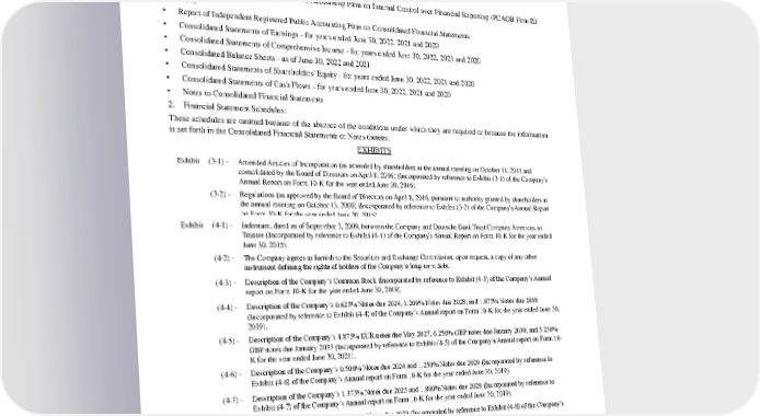 PART IV Item 15. Exhibits and Financial Statement Schedules. 1. Financial Statements: The following Consolidated Financial Statements of The Procter & Gamble Company and subsidiaries, management's report and the reports of the independent registered public accounting firm are incorporated by reference in Part II, Item 8 of this Form 10 - K. • Management's Report on Inter nal Control over Financial Reporting • Report of Independent Registered Public Accounting Firm on Internal Control over Financial Reporting (PCAOB Firm ID is 34) • Report of Independent Registered Public Accounting Firm on Consolidated Financial Statements • Con solidated Statements of Earnings - for years ended June 30, 2022, 2021 and 2020 • Consolidated Statements of Comprehensive Income - for years ended June 30, 2022, 2021 and 2020 • Consolidated Balance Sheets - as of June 30, 2022 and 2021 • Consolidated Statemen ts of Shareholders' Equity - for years ended June 30, 2022, 2021 and 2020 • Consolidated Statements of Cash Flows - for years ended June 30, 2022, 2021 and 2020 • Notes to Consolidated Financial Statements 2. Financial Statement Schedules: These schedules are omitted because of the absence of the conditions under which they are required or because the information is set forth in the Consolidated Financial Statements or Notes thereto. EXHIBITS Exhibit (3 - 1) - Amended Articles of Incorporation (as amended by shareholders at the annual meeting on October 11, 2011 and consolidated by the Board of Directors on April 8, 2016) (Incorporated by reference to Exhibit (3 - 1) of the Company's Annual Re port on Form 10 - K for the year ended June 30, 2016). (3 - 2) - Regulations (as approved by the Board of Directors on April 8, 2016, pursuant to authority granted by shareholders at the annual meeting on October 13, 2009) (Incorporated by reference to Exhibit (3 - 2) of the Company's Annual Report on Form 10 - K for the year ended June 30, 2016). Exhibit (4 - 1) - Indenture, dated as of September 3, 2009, between the Company and Deutsche Bank Trust Company Americas, as Trustee (Incorporated by reference to Exhibit (4 - 1) of the Company's Annual Report on Form 10 - K for the year ended June 30, 2015). (4 - 2) - The Company agrees to furnish to the Securities and Exchange Commission, upon request, a copy of any other instrument defining the rights of holders of the Company’s long - term debt. (4 - 3) - Description of the Company’s Common Stock (Incorporated by reference to Exhibit (4 - 3) of the Company’s Annual report on Form 10 - K for the year ended June 30, 2019). (4 - 4) - Description of the Company’s 0.625% Notes due 2024, 1.200% Notes due 2028, and 1.875% Notes due 2038 (Incorporated by reference to Exhibit (4 - 4) of the Company’s Annual report on Form 10 - K for the year ended June 30, 2019). (4 - 5) - Description of the Company’s 4.875% EUR notes due May 2027, 6.250% GBP notes due January 2030, and 5.250% GBP notes due January 2033 (Incorporated by reference to Exhibit (4 - 5) of the Company’s Annual report on Form 10 - K for the year ended Ju ne 30, 2021). (4 - 6) - Description of the Company’s 0.500% Notes due 2024 and 1.250% Notes due 2029 (Incorporated by reference to Exhibit (4 - 6) of the Company’s Annual report on Form 10 - K for the year ended June 30, 2019). (4 - 7) - Description of the Company’s 1.375% Notes due 2025 and 1.800% Notes due 2029 (Incorporated by reference to Exhibit (4 - 7) of the Company’s Annual report on Form 10 - K for the year ended June 30, 2019). (4 - 8) - Description of the Company’s 1.125% Notes due 2023 (Incorporated by reference to Exhibit (4 - 8) of the Company’s Annual report on Form 10 - K for the year ended June 30, 2019). (4 - 9) - Description of the Company’s 2.000% Notes due 2022 (Incorporated by reference to Exhibit (4 - 11) of the Company’s Annual report on Form 10 - K for the year ended June 30, 2019). (4 - 10) - Description of the Company's 0.350% EUR Notes due 2030 and 0.900% EUR Notes due 2041. + (4 - 11) - Description of the Company's 0.110% Yen Notes due 2026 and 0.230% Yen Notes due 2031. + Exhibit (10 - 1) - The Procter & Gamble 2001 Stock and Incentive Compensation Plan (as amended), which was originally adopted by shareholders at the annual meeting on October 9, 2001 (Incorporated by reference to Exhibit (10 - 1) of the Company’s Annual Report on Form 10 - K for the year ended June 30, 2018).* The Procter & Gamble Company 65