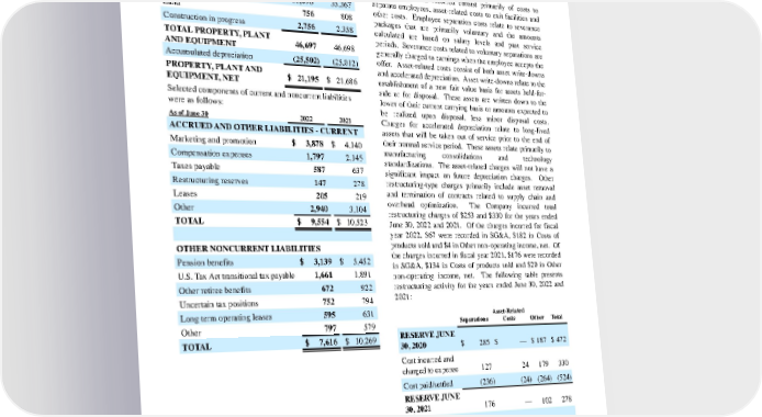 NOTE 3 SUPPLEMENTAL FINANCIAL INFORMATION The components of property, plant and equipment were as follows: As of June 30 2022 2021 PROPERTY, PLANT AND EQUIPMENT Buildings $ 8,087 $ 8,165 Machinery and equipment 35,098 35,367 Land 756 808 Construction in progress 2,756 2,358 TOTAL PROPERTY, PLANT AND EQUIPMENT 46,697 46,698 Accumulated depreciation (25,502) (25,012) PROPERTY, PLANT AND EQUIPMENT, NET $ 21,195 $ 21,686 Selected components of current and noncurrent liabilities were as follows: As of June 30 2022 2021 ACCRUED AND OTHER LIABILITIES - CURRENT Marketing and promotion $ 3,878 $ 4,140 Compensation expenses 1,797 2,145 Taxes payable 587 637 Restructuring reserves 147 278 Leases 205 219 Other 2,940 3,104 TOTAL $ 9,554 $ 10,523 OTHER NONCURRENT LIABILITIES Pension benefits $ 3,139 $ 5,452 U.S. Tax Act transitional tax payable 1,661 1,891 Other retiree benefits 672 922 Uncertain tax positions 752 794 Long term operating leases 595 631 Other 797 579 TOTAL $ 7,616 $ 10,269 RESTRUCTURING PROGRAM The Company has historically incurred an ongoing annual level of restructuring - type activities to maintain a competitive cost structure, including manufacturing and workforce optimization. Before tax costs incurred under ongoing programs have generally ra nged from $250 to $500 annually. Restructuring costs incurred consist primarily of costs to separate employees, asset - related costs to exit facilities and other costs. Employee separation costs relate to severance packages that are primarily voluntary a nd the amounts calculated are based on salary levels and past service periods. Severance costs related to voluntary separations are generally charged to earnings when the employee accepts the offer. Asset - related costs consist of both asset write - downs a nd accelerated depreciation. Asset write - downs relate to the establishment of a new fair value basis for assets held - for - sale or for disposal. These assets are written down to the lower of their current carrying basis or amounts expected to be realized u pon disposal, less minor disposal costs. Charges for accelerated depreciation relate to long - lived assets that will be taken out of service prior to the end of their normal service period. These assets relate primarily to manufacturing consolidations and technology standardizations. The asset - related charges will not have a significant impact on future depreciation charges. Other restructuring - type charges primarily include asset removal and termination of contracts related to supply chain and overhead optimization. The Company incurred total restructuring charges of $253 and $330 for the years ended June 30, 2022 and 2021. Of the charges incurred for fiscal year 2022, $67 were recorded in SG&A, $182 in Costs of products sold and $4 in Other non - opera ting income, net. Of the charges incurred in fiscal year 2021, $176 were recorded in SG&A, $134 in Costs of products sold and $20 in Other non - operating income, net. The following table presents restructuring activity for the years ended June 30, 2022 an d 2021: Separations Asset - Related Costs Other Total RESERVE JUNE 30, 2020 $ 285 $ — $ 187 $ 472 Cost incurred and charged to expense 127 24 179 330 Cost paid/settled (236) (24) (264) (524) RESERVE JUNE 30, 2021 176 — 102 278 Cost incurred and charged to expense 88 87 78 253 Cost paid/settled (143) (87) (154) (384) RESERVE JUNE 30, 2022 $ 121 $ — $ 26 $ 147 46 The Procter & Gamble Company Amounts in millions of dollars except per share amounts or as otherwise specified.