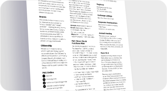 Company and Shareholder Information P&G’s Purpose We will provide branded products and services of superior quality and value that improve the lives of the world’s consumers, now and for generations to come. As a result, consumers will reward us with leadership sales, profit and value creation, allowing our people, our shareholders and the communities in which we live and work to prosper. To learn more, please visit pg.com . Brands P&G products have made a name for themselves by combining “what’s needed” with “what’s possible” — making laundry rooms, living rooms, bedrooms, kitchens, nurseries, and bathrooms a little more enjoyable since 1837. For information on our portfolio of brands and our latest innovations, please visit pg.com/brands . Citizenship We are committed to doing what’s right and being a good corporate citizen. Our Citizenship efforts are focused on Community Impact, Equality & Inclusion and Environmental Sustainability, with a foundation of Ethics & Corporate Responsibility guiding everything we do. P&G Online pg.com news.pg.com twitter.com/proctergamble linkedin.com/company/ procter-and-gamble youtube.com/proctergamble instagram.com/proctergamble Stock Symbol PG Shareowner Services EQ Shareowner Services serves as transfer and dividend paying agent for P&G Common Stock and Administrator of the Procter & Gamble Direct Stock Purchase Plan. Registered shareholders and Plan participants needing account assistance with share transfers, plan purchases/sales, lost stock certificates, etc., should contact EQ Shareowner Services at: Website shareowneronline.com Email shareowneronline.com Click Email under the Contact Us section. Phone Mon–Fri, 7 a.m.–7 p.m., CST 1-800-742-6253 or 1-651-450-4064 P&G Direct Stock Purchase Plan The Procter & Gamble Direct Stock Purchase Plan (DSPP) is a direct stock purchase and dividend reinvestment plan. The DSPP is open to current P&G shareholders as well as new investors and is designed to encourage long-term investment in P&G by providing a convenient and economical way to purchase P&G stock and reinvest dividends. Highlights of the plan include: • Minimum initial investment — $250 • Twice-weekly purchases • 24/7 online account access • Optional cash investment — minimum $50 • Administered by EQ Shareowner Services For complete information on the DSPP, please read the Plan Prospectus. The Prospectus and online Plan Application are available at shareowneronline.com or by contacting EQ Shareowner Services. Transfer Agent EQ Shareowner Services 1110 Centre Pointe Curve, Suite 101 Mendota Heights, MN 55120-4100 Registrar EQ Shareowner Services P.O. Box 64874 St. Paul, MN 55164-0874 Exchange Listings New York Stock Exchange Corporate Headquarters The Procter & Gamble Company 1 P&G Plaza Cincinnati, OH 45202-3315 Annual Meeting The next annual meeting of shareholders will be held on Tuesday, October 11, 2022. A full transcript of the meeting will be available from P&G’s Assistant Secretary, who can be reached at 1 P&G Plaza, Cincinnati, OH 45202-3315. Form 10-K Shareholders may obtain a copy of P&G’s 2022 report to the Securities and Exchange Commission on Form 10-K at no charge by going to pginvestor.com or by sending a written request to EQ Shareowner Services, P.O. Box 64874, St. Paul, MN 55164-0874. The most recent certifications by our Chief Executive and Chief Financial Officers pursuant to Section 302 of the Sarbanes-Oxley Act of 2002 are filed as exhibits to our Form 10-K for the fiscal year ended June 30, 2022. We have also filed with the New York Stock Exchange the most recent Annual CEO certification as required by Section 303A.12(a) of the New York Stock Exchange Listed Company Manual. The Procter & Gamble Company • 73