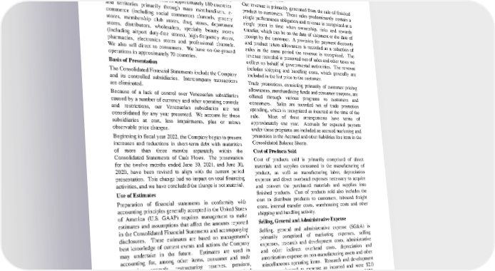 Notes to Consolidated Financial Statements NOTE 1 SUMMARY OF SIGNIFICANT ACCOUNTING POLICIES Nature of Operations The Procter & Gamble Company's (the "Company," "Procter & Gamble," "we" or "us") business is focused on providing branded consumer packaged goods of superior quality and value. Our products are sold in approximately 180 countries and territories primarily through mass merchandisers, e - commerce (including social commerce) channels, grocery stores, membership club stores, drug stores, department stores, distributors, wholesalers, specialty beauty stores (including airport duty - free stores), high - frequency stores, pharmacies, electronics stores and professional channels. We also sell direct to consumers. We have on - the - ground operations in approximately 70 countries. Basis of Presentation The Consolidated Financial Statements include the Company and its controlled subsidiaries. Intercompany transactions are eliminated. Because of a lack of control over Venezuelan subsidiaries caused by a number of currency and other operating controls and restrictions, our Venezuelan subsidiaries are not consolidated for any year presented. We account for those subsidiaries at cost, less impairments, plus or minus observable price changes. Be ginning in fiscal year 2022, the Company began to present increases and reductions in short - term debt with maturities of more than three months separately within the Consolidated Statements of Cash Flows. The presentation for the twelve months ended June 30, 2021, and June 30, 2020, have been revised to align with the current period presentation. This change had no impact on total financing activities, and we have concluded the change is not material. Use of Estimates Preparation of financial statements i n conformity with accounting principles generally accepted in the United States of America (U.S. GAAP) requires management to make estimates and assumptions that affect the amounts reported in the Consolidated Financial Statements and accompanying disclosu res. These estimates are based on management's best knowledge of current events and actions the Company may undertake in the future. Estimates are used in accounting for, among other items, consumer and trade promotion accruals, restructuring reserves, p ensions, postretirement benefits, stock options, valuation of acquired intangible assets, useful lives for depreciation and amortization of long - lived assets, future cash flows associated with impairment testing for goodwill, indefinite - lived intangible as sets and other long - lived assets, deferred tax assets and liabilities, uncertain income tax positions and contingencies. Actual results may ultimately differ from estimates, although management does not generally believe such differences would materially affect the financial statements in any individual year. However, regarding ongoing impairment testing of goodwill and indefinite - lived intangible assets, significant deterioration in future cash flow projections or other assumptions used in estimating fai r values versus those anticipated at the time of the initial valuations, could result in impairment charges that materially affect the financial statements in a given year. Revenue Recognition Our revenue is primarily generated from the sale of finished pr oduct to customers. Those sales predominantly contain a single performance obligation and revenue is recognized at a single point in time when ownership, risks and rewards transfer, which can be on the date of shipment or the date of receipt by the custom er. A provision for payment discounts and product return allowances is recorded as a reduction of sales in the same period the revenue is recognized. The revenue recorded is presented net of sales and other taxes we collect on behalf of governmental auth orities. The revenue includes shipping and handling costs, which generally are included in the list price to the customer. Trade promotions, consisting primarily of customer pricing allowances, merchandising funds and consumer coupons, are offered throug h various programs to customers and consumers. Sales are recorded net of trade promotion spending, which is recognized as incurred at the time of the sale. Most of these arrangements have terms of approximately one year. Accruals for expected payouts un der these programs are included as accrued marketing and promotion in the Accrued and other liabilities line item in the Consolidated Balance Sheets. Cost of Products Sold Cost of products sold is primarily comprised of direct materials and supplies consumed in the manufacturing of product, as well as manufacturing labor, depreciation expense and direct overhead expenses necessary to acquire and convert the purchased materials and supplies into finished products. Cost of products sold also i ncludes the cost to distribute products to customers, inbound freight costs, internal transfer costs, warehousing costs and other shipping and handling activity. Selling, General and Administrative Expense Selling, general and administrative expense (SG&A) is primarily comprised of marketing expenses, selling expenses, research and development costs, administrative and other indirect overhead costs, depreciation and amortization expense on non - manufacturing assets and other miscellaneous operating items. R esearch and development costs are charged to expense as incurred and were $2.0 billion in 2022, $1.9 billion in 2021 and $1.8 billion in 2020. Advertising costs, charged to expense as incurred, include worldwide television, print, radio, internet and in - s tore advertising expenses and were $7.9 billion in 2022, $8.2 billion in 2021 and $7.3 billion in 2020. Non - advertising related components of the Company's total marketing spending reported in SG&A include costs associated with consumer promotions, produc t sampling and sales aids. 42 The Procter & Gamble Company Amounts in millions of dollars except per share amounts or as otherwise