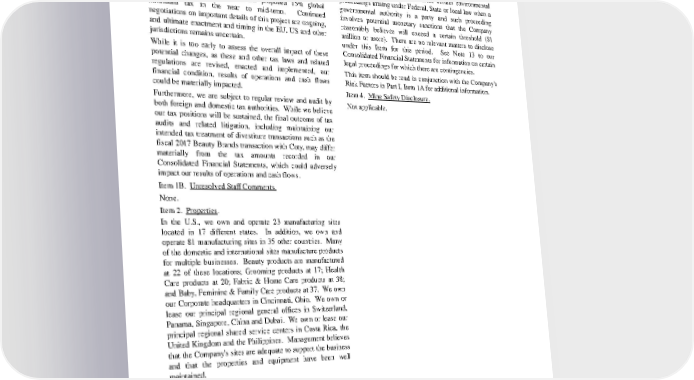 140 member countries of the expanded Organisation for Economic Co - operation and Development (OECD) Inclusive Framework focused on "Addressing the Challenges of the Digitalization of the Economy." The breadth of this project extends beyond pure digital businesses and, as proposed, would likely impact a large portion of multinatio nal businesses by potentially redefining jurisdictional taxation rights in market countries and establishing a global minimum tax. Recent pronouncements related to this project suggest an implementation of the proposed 15% global minimum tax in the near t o mid - term. Continued negotiations on important details of this project are ongoing, and ultimate enactment and timing in the EU, US and other jurisdictions remains uncertain. While it is too early to assess the overall impact of these potential changes, as these and other tax laws and related regulations are revised, enacted and implemented, our financial condition, results of operations and cash flows could be materially impacted. Furthermore, we are subject to regular review and audit by both foreign an d domestic tax authorities. While we believe our tax positions will be sustained, the final outcome of tax audits and related litigation, including maintaining our intended tax treatment of divestiture transactions such as the fiscal 2017 Beauty Brands tr ansaction with Coty, may differ materially from the tax amounts recorded in our Consolidated Financial Statements, which could adversely impact our results of operations and cash flows. Item 1B. Unresolved Staff Comments. None. Item 2. Properties . In the U.S., we own and operate 23 manufacturing sites located in 17 different states. In addition, we own and operate 81 manufacturing sites in 35 other countries. Many of the domestic and international sites manufacture products for multiple businesses. Bea uty products are manufactured at 22 of these locations; Grooming products at 17; Health Care products at 20; Fabric & Home Care products at 38; and Baby, Feminine & Family Care products at 37. We own our Corporate headquarters in Cincinnati, Ohio. We own or lease our principal regional general offices in Switzerland, Panama, Singapore, China and Dubai. We own or lease our principal regional shared service centers in Costa Rica, the United Kingdom and the Philippines. Management believes that the Company 's sites are adequate to support the business and that the properties and equipment have been well maintained. Item 3. Legal Proceedings . The Company is subject, from time to time, to certain legal proceedings and claims arising out of our business, whic h cover a wide range of matters, including antitrust and trade regulation, product liability, advertising, contracts, environmental issues, patent and trademark matters, labor and employment matters and tax. In addition, SEC regulations require that we di sclose certain environmental proceedings arising under Federal, State or local law when a governmental authority is a party and such proceeding involves potential monetary sanctions that the Company reasonably believes will exceed a certain threshold ($1 m illion or more). There are no relevant matters to disclose under this Item for this period. See Note 13 to our Consolidated Financial Statements for information on certain legal proceedings for which there are contingencies. This item should be read in c onjunction with the Company's Risk Factors in Part I, Item 1A for additional information. Item 4. Mine Safety Disclosure. Not applicable. The Procter & Gamble Company 9