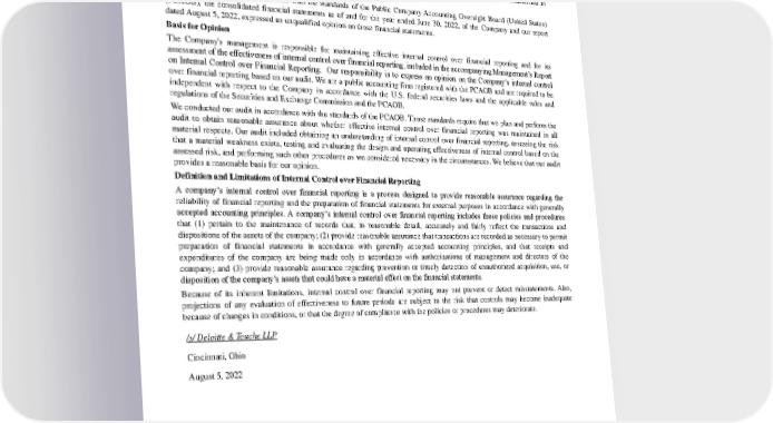 REPORT OF INDEPENDENT REGISTERED PUBLIC ACCOUNTING FIRM To the shareholders and the Board of Directors of The Procter & Gamble Company Opinion on Internal Control over Financial Reporting We have audited the internal control over financial reporting of The Procter & Gamble Company and subsidiaries (the "Company") as of June 30, 2022, based on criteria established in Internal Control — Integrated Framework (2013) issued by the Committee of S ponsoring Organizations of the Treadway Commission (COSO). In our opinion, the Company maintained, in all material respects, effective internal control over financial reporting as of June 30, 2022, based on criteria establis hed in Internal Control — Integr ated Framework (2013) issued by COSO. We have also audited, in accordance with the standards of the Public Company Accounting Oversight Board (United States) (PCAOB), the consolidated financial statements as of and for the year ended June 30, 2022, of the Company and our report dated August 5, 2022, expressed an unqualified opinion on those financial statements. Basis for Opinion The Company's management is responsible for maintaining effective internal control over financial reporting and for its assessme nt of the effectiveness of internal control over financial reporting, included in the accompanying Management’s Report on Internal Control over Financial Reporting. Our responsibility is to express an opinion on the Company’s internal control over financi al reporting based on our audit. We are a public accounting firm registered with the PCAOB and are required to be independent with respect to the Company in accordance with the U.S. federal securities laws and the applicable rules and regulations of the Se curities and Exchange Commission and the PCAOB. We conducted our audit in accordance with the standards of the PCAOB. Those standards require that we plan and perform the audit to obtain reasonable assurance about whether effective internal control over fi nancial reporting was maintained in all material respects. Our audit included obtaining an understanding of internal control over financial reporting, assessing the risk that a material weakness exists, testing and evaluating the design and operating effec tiveness of internal control based on the assessed risk, and performing such other procedures as we considered necessary in the circumstances. We believe that our audi t provides a reasonable basis for our opinion. Definition and Limitations of Internal Co ntrol over Financial Reporting A company’s internal control over financial reporting is a process designed to provide reasonable assurance regarding the reliability of financial reporting and the preparation of financial statements for external purposes i n accordance with generally accepted accounting principles. A company’s internal control over financial reporting includes those policies and procedures that (1) pertain to the maintenance of records that, in reasonable detail, accurately and fairly reflec t the transactions and dispositions of the assets of the company; (2) provide reasonable assurance that transactions are recorded as necessary to pe rmit preparation of financial statements in accordance with generally accepted accounting principles, and th at receipts and expenditures of the company are being made only in accordance with authorizations of management and directors of the company; and (3) provide reasonable assurance regarding prevention or timely detection of unauthorized acquisition, use, or disposition of the company’s assets that could have a material effect on the financial statements. Because of its inherent limitations, internal control over financial reporting may not prevent or detect misstatements. Also, projections of any evaluation of effectiveness to future periods are subject to the risk that controls may become inadequate becau se of changes in conditions, or that the degree of compliance with the policies or procedures may deteriorate. /s/ Deloitte & Touche LLP Cincinnati, Ohio August 5, 2022 36 The Procter & Gamble Company