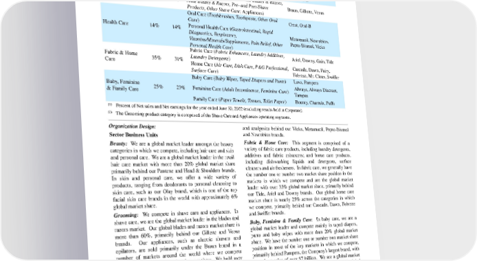 The following provides additional detail on our reportabl e segments and the ten product categories and brand composition within each segment. Reportable Segments % of Net Sales (1) % of Net Earnings (1) Product Categories (Sub - Categories) Major Brands Beauty 18% 22% Hair Care ( Conditioner, Shampoo, Styling Aids, Treatments ) Head & Shoulders, Herbal Essences, Pantene, Rejoice Skin and Personal Care ( Antiperspirant and Deodorant, Personal Cleansing, Skin Care ) Olay, Old Spice, Safeguard, Secret, SK - II Grooming 8% 10% Grooming (2) (Shave Care - Female Blades & Razors, Male Blades & Razors, Pre - and Post - Shave Products, Other Shave Care; Appliances) Braun, Gillette, Venus Health Care 14% 14% Oral Care ( Toothbrushes, Toothpaste, Other Oral Care ) Crest, Oral - B Personal Health Care ( Gastrointestinal, Rapid Diagnostics, Respiratory, Vitamins/Minerals/Supplements, Pain Relief, Other Personal Health Care ) Metamucil, Neurobion, Pepto - Bismol, Vicks Fabric & Home Care 35% 31% Fabric Care ( Fabric Enhancers, Laundry Additives, Laundry Detergents ) Ariel, Downy, Gain, Tide Home Care ( Air Care, Dish Care, P&G Professional, Surface Care ) Cascade, Dawn, Fairy, Febreze, Mr. Clean, Swiffer Baby, Feminine & Family Care 25% 23% Baby Care ( Baby Wipes, Taped Diapers and Pants ) Luvs, Pampers Feminine Care ( Adult Incontinence, Feminine Care ) Always, Always Discreet, Tampax Family Care ( Paper Towels, Tissues, Toilet Paper ) Bounty, Charmin, Puffs (1) Percent of Net sales and Net earnings for the year ended June 30, 2022 (excluding results held in Corporate). (2) The Grooming product category is comprised of the Shave Care and Appliances operating segments. Organization Design: Sector Business Units Beauty: We are a global m arket leader amongst the beauty categories in which we compete, including hair care and skin and personal care. We are a global market leader in the retail hair care market with more than 20% global market share primarily behind our Pantene and Head & Shoulders brands. In skin and personal care, we offer a wide variety of products, ranging from deodorants to personal cleansing to skin care, such as our Olay brand, which is one of the top faci al skin care brands in the world with approximately 6% global market share. Grooming: We compete in shave care and appliances. In shave care, we are the global market leader in the blades and razors market. Our global blades and razors market share is more than 60%, primarily behind our Gillette and Venus brands. Our appliances, such as electric shavers and epilators, are sold primarily under the Braun brand in a number of markets around the world where we compete against both global and regional compe titors. We hold over 25% of the male electric shavers market and over 65% of the female epilators market. Health Care: We compete in oral care and personal health care. In oral care, there are several global competitors in the market and we have the num ber two market share position with nearly 20% global market share behind our Crest and Oral - B brands. In personal health care, we are a global market leader among the categories in which we compete, including respiratory treatments, digestive wellness, vi tamins and analgesics behind our Vicks, Metamucil, Pepto - Bismol and Neurobion brands. Fabric & Home Care: This segment is comprised of a variety of fabric care products, including laundry detergents, additives and fabric enhancers; and home care products , including dishwashing liquids and detergents, surface cleaners and air fresheners. In fabric care, we generally have the number one or number two market share position in the markets in which we compete and are the global market leader with over 35% glo bal market share, primarily behind our Tide, Ariel and Downy brands. Our global home care market share is nearly 25% across the categories in which we compete, primarily behind our Cascade, Dawn, Febreze and Swiffer brands. Baby, Feminine & Family Care: In baby care, we are a global market leader and compete mainly in taped diapers, pants and baby wipes with more than 20% global market share. We have the number one or number two market share position in most of the key markets in which we compete, primar ily behind Pampers, the Company's largest brand, with annual net sales of over $7 billion. We are a global market leader in the feminine care category with over 20% global market share, primarily behind our Always and Tampax brands. We also compete in th e adult incontinence category in certain markets behind Always Discreet, with over 10% market share in the key markets in which we compete. Our family care business is predominantly a North American business comprised primarily of the Bounty paper towel a nd The Procter & Gamble Company 15