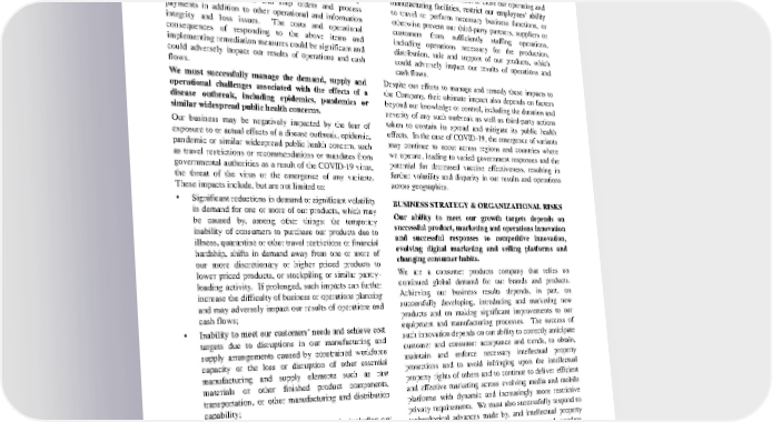 be exposed to potential liability, litigation, governmental inquiries, investigations or regulatory enforcement actions; and we could be subject to payment of fines or other penalties, legal claims by our suppliers, customers or employees and significant remediation costs. Periodically, we also upgrade our IT/OT systems or adopt new technologies. If such a new system or technology does not function properly or otherwise exposes us to increased cybersecurity breaches and failures, it could affect our ability to order materials, make and ship orders and process payments in addition to other operational and information integrity and loss issues. The costs and operational consequences of responding to the above items and implementing remediation measures could be significant and could adversely impact our results of operations and cash flows. We must successfully manage the demand, supply and operational challenges associated with the effects of a disease outbreak, including epidemics, pandemics or similar widespread public health concerns. Our business may be negatively impacted by the fear of exposure to or actual effects of a disease outbreak, epidemic, pandemic or similar widespread public health concern, such as travel restrictions or recommendations or mandates from governmental authorities as a result of the COVID - 19 virus, the threat of the virus or the emergence of any variants. These impacts include, but are not limited to: • Significant reductions in demand or significant volatility in demand for one or more of our products, which may be caused by, among other things: the temporary inability of consumers to purchase our products due to illness, quarantine or other travel restrictions or financial hardship, shifts in demand away from one or more of our more discretionary or higher priced products to lower priced products, or stockpiling or similar pantry - loading activity. If prolonged, such impacts can further increase the difficulty of business or operations planning and may adversely impact our results of operations and cash flows; • Ina bility to meet our customers’ needs and achieve cost targets due to disruptions in our manufacturing and supply arrangements caused by constrained workforce capacity or the loss or disruption of other essential manufacturing and supply elements such as raw materials or other finished product components, transportation, or other manufacturing and distribution capability; • Failure of third parties on which we rely, including our suppliers, contract manufacturers, distributors, contractors, commercial banks, j oint venture partners and external business partners, to meet their obligations to the Company, or significant disruptions in their ability to do so, which may be caused by their own financial or operational difficulties and may adversely impact our operat ions; • Periods of disruption that limit the ability to access the financial markets or which increase the cost of liquidity; or • Significant changes in the political conditions in markets in which we manufacture, sell or distribute our products, including qu arantines, import/export restrictions, price controls, or governmental or regulatory actions, closures or other restrictions that limit or close our operating and manufacturing facilities, restrict our employees’ ability to travel or perform necessary busi ness functions, or otherwise prevent our third - party partners, suppliers or customers from sufficiently staffing operations, including operations necessary for the production, distribution, sale and support of our products, which could adversely impact our results of operations and cash flows. Despite our efforts to manage and remedy these impacts to the Company, their ultimate impact also depends on factors beyond our knowledge or control, including the duration and severity of any such outbreak as well as third - party actions taken to contain its spread and mitigate its public health effects. In the case of COVID - 19, the emergence of variants may continue to occur across regions and countries where we operate, leading to varied government responses and the potential for decreased vaccine effectiveness, resulting in further volatility and disparity in our results and operations across geographies. BUSINESS STRATEGY & ORGANIZATIONAL RISKS Our ability to meet our growth targets depends on successful product, marketing and operations innovation and successful responses to competitive innovation, evolving digital marketing and selling platforms and changing consumer habits. We are a consumer products company that relies on continued global demand for our brands and products. Achieving our business results depends, in part, on successfully developing, introducing and marketing new products and on making significant improvements to our equipment and manufacturing processes. The success of such innovation depends on our ability to correctly anticipate customer and consumer acceptance and trends, to obtain, maintain and enforce necessary intellectual property protections and to avoid infringing upon the intellectual property rights of others and to continue to deli ver efficient and effective marketing across evolving media and mobile platforms with dynamic and increasingly more restrictive privacy requirements. We must also successfully respond to technological advances made by, and intellectual property rights gra nted to, competitors, customers and vendors. Failure to continually innovate, improve and respond to competitive moves, platform evolution and changing consumer habits could compromise our competitive position and adversely impact our financial condition, results of operations or cash flows. We must successfully manage ongoing acquisition, joint venture and divestiture activities. The Procter & Gamble Company 7