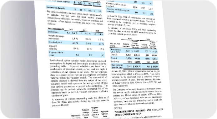 and/or is no longer required to provide services to earn the award. Stock - based compensation expense is included as part of Co st of products sold and SG&A in the Consolidated Statement of Earnings and includes an estimate of forfeitures, which is based on historical data. Total expense and related tax benefit were as follows: Years ended June 30 2022 2021 2020 Stock options $ 271 $ 279 $ 249 RSUs and PSUs 257 261 309 Total stock - based expense $ 528 $ 540 $ 558 Income tax benefit $ 88 $ 102 $ 97 We utilize an industry standard lattice - based valuation model to calculate the fair value for stock options granted. Assumptions utilized in the model, which are evaluated and revised to reflect market conditions and experience, were as follows: Years ended June 30 2022 2021 2020 Interest rate 0.1 - 1.6 % 0. 1 - 0.7 % 1.1 - 1.4 % Weighted average interest rate 1.5 % 0.6 % 1.3 % Dividend yield 2.4 % 2.4 % 2.4 % Expected volatility 19 % 20 % 17 % Expected life in years 9.1 9.2 9.2 Lattice - based option valuation models incorporate ranges of assumptions for inputs and those ranges are disclosed in the preceding table. Expected volatilities are based on a combination of historical volatility of our stock and implied volatilities of call options on our stock. We use historical data to estimate option exercise and employee termination patterns within the valuation model. The expected life of options granted is derived from the outpu t of the option valuation model and represents the average period of time that options granted are expected to be outstanding. The interest rate for periods within the contractual life of the options is based on the U.S. Treasury yield curve in effect at the time of grant. A summary of options outstanding under the plans as of June 30, 2022, and activity during the year then ended is presented below: Options Options (in thousands) Weighted Average Exercise Price Weighted Average Contract - ual Life in Years Aggregate Intrinsic Value Outstanding at July 1, 2021 138,272 $ 91.24 Granted 14,369 141.67 Exercised (25,040) 77.07 Forfeited/expired (886) 116.38 Outstanding at June 30, 2022 126,715 $ 99.59 5.4 $ 5,618 Exercisable 86,992 $ 84.89 4.0 $ 5,124 The following table provides additional information on stock options: Years ended June 30 2022 2021 2020 Weighted average grant - date fair value of options granted $ 21.55 $ 20.94 $ 15.60 Intrinsic value of options exercised 1,886 1,401 1,455 Grant - date fair value of options that vested 177 236 217 Cash received from options exercised 1,930 1,705 2,019 Actual tax benefit from options exercised 399 292 298 At June 30, 2022, $166 of compensation cost had not yet been recognized related to stock option grants. That cost is expected to be recognized over a remaining weighted average period of 1.5 years. A summary of non - vested RSUs and PSUs outstanding under the plans as of June 30, 2022, and activity during the year then ended is presented below: RSUs PSUs RSU and PSU awards Units (in thousands) Weighted Average Grant Date Fair Value Units (in thousands) Weighted Average Grant Date Fair Value Non - vested at July 1, 2021 3,237 $ 114.68 971 $ 135.24 Granted 1,365 141.13 539 152.69 Vested (1,656) 109.08 (550) 121.62 Forfeited (114) 123.06 (32) 152.89 Non - vested at June 30, 2022 2,832 $ 130.37 928 $ 152.94 At June 30, 2022, $216 of compensation cost had not yet been recognized related to RSUs and PSUs. That cost is expected to be recognized over a remaining weighted average period of 1.6 years. The total grant date fair value of shares vested was $248, $266 and $264 in 2022, 2021 and 2020, respectively. The Company settles equity issuances with treasury shares. We have no specific policy to repurchase common shares to mitigate the dilutive impact of options, RSUs and PSUs. However, we have historically made adequate discretionary purchases, based on cash availability, market trends and other factors, to offset the impacts of such activity. NOTE 8 POSTRETIREMENT BENEFITS AND EMPLOYEE STOCK OWNERSHIP PLAN We offer various post retirement benefits to our employees. Defined Contribution Retirement Plans We have defined contribution plans, which cover the majority of our U.S. employees, as well as employees in certain other countries. These plans are fully funded. We generally ma ke contributions to participants' accounts based on individual base salaries and years of service. Total global defined contribution expense was $366, $340 and $317 in 2022, 2021 and 2020, respectively. The Procter & Gamble Company 51 Amounts in millions of dollars except per share amounts or as otherwise specified.