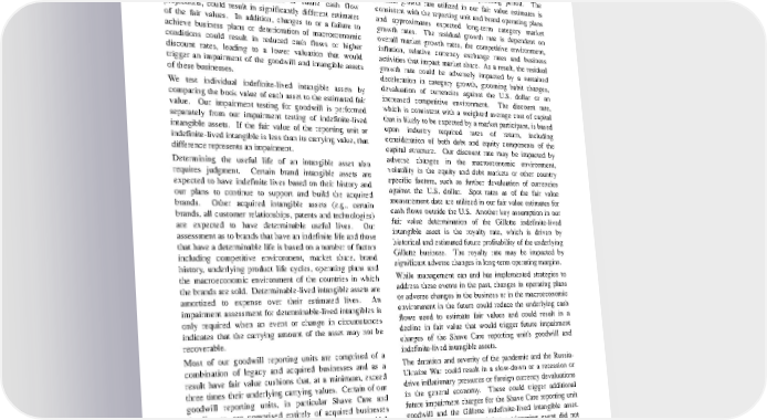 capital, are consistent with internal projections and operating plans. We believe these estimates and assumptions are reasonable and comparable to those that would be used by other marketplace participants. Unanticipated market or macroeconomic events and circumstances may occur, which coul d affect the accuracy or validity of the estimates and assumptions. For example, future changes in the judgments, assumptions and estimates that are used in our impairment testing for goodwill and indefinite - lived intangible assets, including discount and tax rates or future cash flow projections, could result in significantly different estimates of the fair values. In addition, changes to or a failure to achieve business plans or deterioration of macroeconomic conditions could result in reduced cash flow s or higher discount rates, leading to a lower valuation that would trigger an impairment of the goodwill and intangible assets of these businesses. We test individual indefinite - lived intangible assets by comparing the book value of each asset to the esti mated fair value. Our impairment testing for goodwill is performed separately from our impairment testing of indefinite - lived intangible assets. If the fair value of the reporting unit or indefinite - lived intangible is less than its carrying value, that difference represents an impairment. Determining the useful life of an intangible asset also requires judgment. Certain brand intangible assets are expected to have indefinite lives based on their history and our plans to continue to support and build the acquired brands. Other acquired int angible assets (e.g., certain brands, all customer relationships, patents and technologies) are expected to have determinable useful lives. Our assessment as to brands that have an indefinite life and those that have a determinable life is based on a numb er of factors including competitive environment, market share, brand history, underlying product life cycles, operating plans and the macroeconomic environment of the countries in which the brands are sold. Determinable - lived intangible assets are amortiz ed to expense over their estimated lives. An impairment assessment for determinable - lived intangibles is only required when an event or change in circumstances indicates that the carrying amount of the asset may not be recoverable. Most of our goodwill r eporting units are comprised of a combination of legacy and acquired businesses and as a result have fair value cushions that, at a minimum, exceed three times their underlying carrying values. Certain of our goodwill reporting units, in particular Shave Care and Appliances, are comprised entirely of acquired businesses and as a result have fair value cushions that are not as high as our legacy businesses. The Appliances reporting unit has a fair value that significantly exceeds the underlying carrying va lue. Based on our annual impairment testing during the three months ended December 31, 2021, the Shave Care reporting unit's fair value exceeded its carrying value by more than 30% and the Gillette indefinite - lived intangible asset's fair value exceeded its carrying value by approximately 5%. The most significant assumptions utilized in the determination of the estimated fair values of the Shave Care reporting unit and the Gillette indefinite - lived intangible asset are the net sales and earnings growth rates (includin g residual growth rates) and discount rate. The residual growth rate represents the expected rate at which the reporting unit and Gillette brand are expected to grow beyond the shorter - term business planning period. The residual growth rate utilized in o ur fair value estimates is consistent with the reporting unit and brand operating plans and approximates expected long - term category market growth rates. The residual growth rate is dependent on overall market growth rates, the competitive environment, in flation, relative currency exchange rates and business activities that impact market share. As a result, the residual growth rate could be adversely impacted by a sustained deceleration in category growth, grooming habit changes, devaluation of currencies against the U.S. dollar or an increased competitive environment. The discount rate, which is consistent with a weighted average cost of capital that is likely to be expected by a market participant, is based upon industry required rates of return, includ ing consideration of both debt and equity components of the capital structure. Our discount rate may be impacted by adverse changes in the macroeconomic environment, volatility in the equity and debt markets or other country specific factors, such as furt her devaluation of currencies against the U.S. dollar. Spot rates as of the fair value measurement date are utilized in our fair value estimates for cash flows outside the U.S. Another key assumption in our fair value determination of the Gillette indefi nite - lived intangible asset is the royalty rate, which is driven by historical and estimated future profitability of the underlying Gillette business. The royalty rate may be impacted by significant adverse changes in long - term operating margins. While management can and has implemented strategies to address these events in the past, changes in operating plans or adverse changes in the business or in the macroeconomic environment in the future could reduce the underlying cash flows used to estimate fair values and could result in a decline in fair value that would trigger future impairment charges of the Shave Care reporting unit's goodwill and indefinite - lived intangible assets. The duration and severity of the pandemic and the Russia - Ukraine War c ould result in a slow - down or a recession or drive inflationary pressures or foreign currency devaluations in the general economy. These could trigger additional future impairment charges for the Shave Care reporting unit goodwill and the Gillette indefin ite - lived i