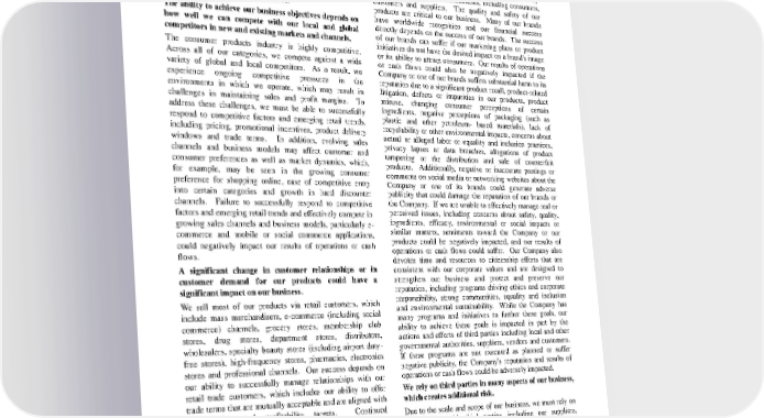 materials like pulp) and raw and packaging materials and the costs of labor, transportat ion (including trucks and containers), energy, pension and healthcare. Inflation pressures could also result in increases in these input costs. Therefore, our business results depend, in part, on our continued ability to manage these fluctuations through pricing actions, cost saving projects and sourcing decisions, while maintaining and improving margins and market share. Failure to manage these fluctuations could adversely impact our results of operations or cash flows. The ability to achieve our busine ss objectives depends on how well we can compete with our local and global competitors in new and existing markets and channels. The consumer products industry is highly competitive. Across all of our categories, we compete against a wide variety of globa l and local competitors. As a result, we experience ongoing competitive pressures in the environments in which we operate, which may result in challenges in maintaining sales and profit margins. To address these challenges, we must be able to successfull y respond to competitive factors and emerging retail trends, including pricing, promotional incentives, product delivery windows and trade terms. In addition, evolving sales channels and business models may affect customer and consumer preferences as well as market dynamics, which, for example, may be seen in the growing consumer preference for shopping online, ease of competitive entry into certain categories and growth in hard discounter channels. Failure to successfully respond to competitive factors a nd emerging retail trends and effectively compete in growing sales channels and business models, particularly e - commerce and mobile or social commerce applications, could negatively impact our results of operations or cash flows. A significant change in cu stomer relationships or in customer demand for our products could have a significant impact on our business. We sell most of our products via retail customers, which include mass merchandisers, e - commerce (including social commerce) channels, grocery store s, membership club stores, drug stores, department stores, distributors, wholesalers, specialty beauty stores (including airport duty - free stores), high - frequency stores, pharmacies, electronics stores and professional channels. Our success depends on our ability to successfully manage relationships with our retail trade customers, which includes our ability to offer trade terms that are mutually acceptable and are aligned with our pricing and profitability targets. Continued concentration among our retai l customers could create significant cost and margin pressure on our business, and our business performance could suffer if we cannot reach agreement with a key customer on trade terms and principles. Our business could also be negatively impacted if a ke y customer were to significantly reduce the inventory level of or shelf space allocated to our products as a result of increased offerings of other branded manufacturers, private label brands and generic non - branded products or for other reasons, significa ntly tighten product delivery windows or experience a significant business disruption. If the reputation of the Company or one or more of our brands erodes significantly, it could have a material impact on our financial results. The Company's reputation, a nd the reputation of our brands, form the foundation of our relationships with key stakeholders and other constituencies, including consumers, customers and suppliers. The quality and safety of our products are critical to our business. Many of our brand s have worldwide recognition and our financial success directly depends on the success of our brands. The success of our brands can suffer if our marketing plans or product initiatives do not have the desired impact on a brand's image or its ability to at tract consumers. Our results of operations or cash flows could also be negatively impacted if the Company or one of our brands suffers substantial harm to its reputation due to a significant product recall, product - related litigation, defects or impuritie s in our products, product misuse, changing consumer perceptions of certain ingredients, negative perceptions of packaging (such as plastic and other petroleum - based materials), lack of recyclability or other environmental impacts, concerns about actual o r alleged labor or equality and inclusion practices, privacy lapses or data breaches, allegations of product tampering or the distribution and sale of counterfeit products. Additionally, negative or inaccurate postings or comments on social media or netwo rking websites about the Company or one of its brands could generate adverse publicity that could damage the reputation of our brands or the Company. If we are unable to effectively manage real or perceived issues, including concerns about safety, quality , ingredients, efficacy, environmental or social impacts or similar matters, sentiments toward the Company or our products could be negatively impacted, and our results of operations or cash flows could suffer. Our Company also devotes time and resources to citizenship efforts that are consistent with our corporate values and are designed to strengthen our business and protect and preserve our reputation, including programs driving ethics and corporate responsibility, strong communities, equality and inclu sion and environmental sustainability. While the Company has many programs and initiatives to further these goals, our ability to achieve these goals is impacted in part by the actions and efforts of third parties including local and other governmental au thorities, suppliers, vendors and customers. If these programs are not executed as planned or suffer negative publicity, the Company's reputation and results of operations or cash flows could be adversely impacted. We rely on third parties in many aspects of our busi