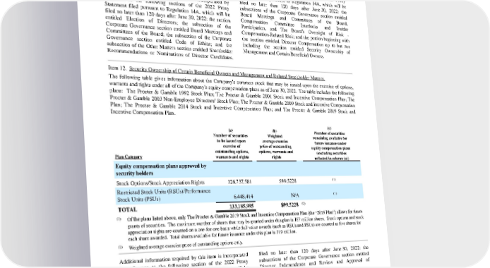 PART III Item 10. Directors, Executive Officers and Corporate Governance. The Board of Directors has determined that the following members of the Audit Committee are independent and are Audit Committee financial experts as defined by SEC rules: Ms. Patricia A. Woertz (Chair) and Ms. Christine M. McCarthy. The information required by this item is incorporated by reference to the following sections of the 2022 Proxy Statement filed pursuant to Regulation 14A, which will be filed no later than 120 days after June 30, 2022: the section entitled Election of Directors; the subsection of the Corporate Governance section entitled Board Meetings and Committee s of the Board; the subsection of the Corporate Governance section entitled Code of Ethics; and the subsection of the Other Matters section entitled Shareholder Recommendations or Nominations of Director Candidates. Pursuant to the Instruction to Item 401 of Regulation S - K, Executive Officers of the Registrant are reported in Part I of this report. Item 11. Executive Compensation. The information required by this item is incorporated by reference to the following sections of the 2022 Proxy Statement filed pursuant to Regulation 14A, which will be filed no later than 120 days after June 30, 2022: the subsections of the Corporate Governance section entitled Board Meetings and Committees of the Board, Compensation Committee Interlocks and Insid er Participation, and The Board's Oversight of Risk - Compensation - Related Risk; and the portion beginning with the section entitled Director Compensation up to but not including the section entitled Security Ownership of Management and Certain Beneficial Owners. Item 12. Security Ownership of Certain Beneficial Owners and Management and Related Stockholder Matters. The following table gives information about the Company's common stock that may be issued upon the exercise of options, warrants and rights under all of the Company's equity compensation plans as of June 30, 2022. The table includes the following plans: The Procter & Gamble 1992 Stock Plan; The Procter & Gamble 2001 Stock and Incentive Compensation Plan; The Procter & Gam ble 2003 Non - Employee Directors' Stock Plan; The Procter & Gamble 2009 Stock and Incentive Compensation Plan; The Procter & Gamble 2014 Stock and Incentive Compensation Plan; and The Procter & Gamble 2019 Stock and Incentive Compensation Plan. Plan Category (a) Number of securities to be issued upon exercise of outstanding options, warrants and rights (b) Weighted average exercise price of outstanding options, warrants and rights (c) Number of securities remaining available for future issuance under equity compensation plans (excluding securities reflected in column (a)) Equity compensation plans approved by security holders Stock Options/Stock Appreciation Rights 126,737,581 $99.5228 (1) Restricted Stock Units (RSUs)/Performance Stock Units (PSUs) 6,448,414 N/A (1) TOTAL 133,185,995 $99.5228 (2) (1) Of the plans listed above, only The Procter & Gamble 2019 Stock and Incentive Compensation Plan (the “2019 Plan”) allows for future grants of securities. The maximum number of shares that may be granted under this plan is 187 million shares. Stock options and stock appreciation rights are counted on a one - for - one basis while full value awards (such as RSUs and PSUs) are counte d as five shares for each share awarded. Total shares available for future issuance under this plan is 119 million. (2) Weighted average exercise price of outstanding options only. Additional information required by this item is incorporated by reference to the following section of the 2022 Proxy Statement filed pursuant to Regulation 14A, which will be filed no later than 120 days after June 30, 2022: the subsection of the Beneficial Ownership section entitled Security Ownership of Management and Certain Beneficial Owners. Item 13. Certain Relationships and Related Transactions and Director Independence. The information required by this item is incorporated by reference to the following sections of the 2022 Proxy Statement filed pursuant to Regulation 14A, which will be filed no later than 120 days after June 30, 2022: the subsections of the Corporate Governance section entitled Director Independence and Review and Approval of Transactions with Related Persons. Item 14. Principal Accountant Fees and Services. The information required by this item is incorporated by reference to the following section of the 2022 Proxy Statement filed pursuant to Regulation 14A, which will be filed no later than 120 days after June 30, 2022: Report of the Audit Committee, which ends with the subsection entitled Services Provided by Deloitte. 64 The Procter & Gamble Company