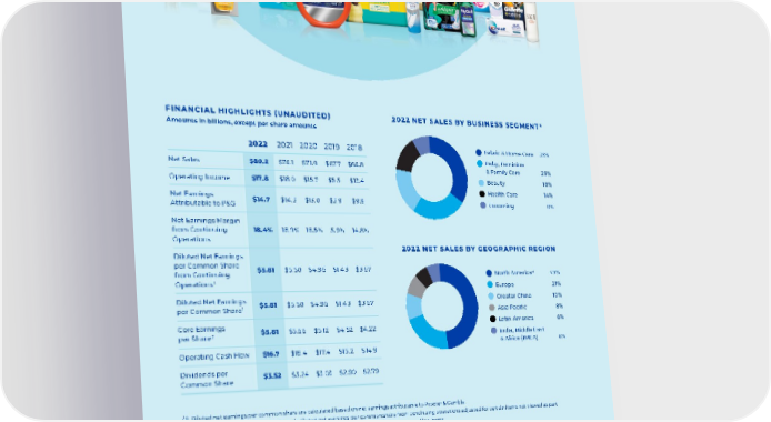 FINANCIAL HIGHLIGHTS (UNAUDITED) Amounts in billions, except per share amounts N/A 2022 2021 2020 2019 2018 Net Sales $80.2 $76.1 $71.0 $67.7 $66.8 Operating Income $17.8 $18.0 $15.7 $5.5 $13.4 Net Earnings Attributable to P&G $14.7 $14.3 $13.0 $3.9 $9.8 Net Earnings Margin from Continuing Operations 18.4% 18.9% 18.5% 5.9% 14.8% Diluted Net Earnings per Common Share from Continuing Operations 1 $5.81 $5.50 $4.96 $1.43 $3.67 Diluted Net Earnings per Common Share 1 $5.81 $5.50 $4.96 $1.43 $3.67 Core Earnings per Share 2 $5.81 $5.66 $5.12 $4.52 $4.22 Operating Cash Flow $16.7 $18.4 $ 17.4 $15.2 $14.9 Dividends per Common Share $3.52 $3.24 $3.03 $2.90 $2.79 2022 NET SALES BY BUSINESS SEGMENT 3 Fabric & Home Care 35% Baby, Feminine & Family Care 25% Beauty 18% Health Care 14% Grooming 8% 2022 NET SALES BY GEOGRAPHIC REGION North America 4 49% Europe 21% Greater China 10% Asia Pacific 8% Latin America 6% India, Middle East & Africa (IMEA) 6% (1) Diluted net earnings per common share are calculated based on net earnings attributable to Procter & Gamble. (2) Core EPS is a measure of the Company’s diluted net earnings per common share from continuing operations adjusted for certain items not viewed as part of our sustainable results. Please see page 74 of the Annual Report for detail on the reconciling items. (3) These results exclude net sales in Corporate. (4) North America includes the United States, Canada and Puerto Rico. VARIOUS STATEMENTS IN THIS ANNUAL REPORT , including estimates, projections, objectives and expected results, are “forward-looking statements” within the meaning of the Private Securities Litigation Reform Act of 1995, Section 27A of the Securities Act of 1933 and Section 21E of the Securities Exchange Act of 1934 and are generally identified by the words “believe,” “expect,” “anticipate,” “intend,” “opportunity,” “plan,” “project,” “will,” “should,” “could,” “would,” “likely” and similar expressions. Forward-looking statements are based on current assumptions that are subject to risks and uncertainties that may cause actual results to differ materially from the forward-looking statements, including the risks and uncertainties discussed in Item 1A – Risk Factors of the Form 10-K included in this Annual Report. Such forward-looking statements speak only as of the date they are made, and we undertake no obligation to update or revise publicly any forward-looking statements, except as required by law. Brand names referenced in this Annual Report are trademarks of The Procter & Gamble Company or one of its subsidiaries. All other brand names are trademarks of their respective owners.