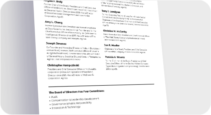 Board of Directors B. Marc Allen Chief Strategy Officer and Senior Vice President of Strategy and Corporate Development at The Boeing Company (aerospace, commercial jetliners, and military defense systems). Director since 2021. Age 49. Angela F. Braly Former Chair of the Board, President and Chief Executive Officer of WellPoint, Inc. (healthcare insurance), now known as Elevance Health. Director since 2009. Also a Director of Brookfield Asset Management and ExxonMobil Corporation. Age 61. Amy L. Chang Former Executive Vice President and Executive Advisor at Cisco Systems, Inc. (networking). Founder and former Chief Executive Officer of Accompany, Inc. (relationship intelligence). Director since 2017. Also a Director of The Walt Disney Company and Marqeta. Age 45. Joseph Jimenez Co-Founder and Managing Director of Aditum Bio (biotech venture fund). Former Chief Executive Officer of Novartis AG (global healthcare). Director since 2018. Also a Director of General Motors, Graphite Bio, and Century Therapeutics. Age 62. Lead Independent Director. Christopher Kempczinski President and Chief Executive Officer of McDonald’s Corporation (restaurant operator and franchisor). Director since 2021. Also a Director of McDonald’s Corporation. Age 53. Debra L. Lee Chair of Leading Women Defined Foundation (nonprofit education and advocacy organization). Former Chairman and Chief Executive Officer of BET Networks (media and entertainment). Director since 2020. Also a Director of Marriott International, Inc., Burberry Group plc, and Warner Bros. Discovery. Age 68. Terry J. Lundgren Former Operating Partner of Long-Term Private Capital (a BlackRock private equity fund). Former Executive Chairman of the Board and Chairman and Chief Executive Officer of Macy’s, Inc. (national retailer). Director since 2013. Age 70. Christine M. McCarthy Senior Executive Vice President and Chief Financial Officer of The Walt Disney Company (global entertainment). Director since 2019. Age 67. Jon R. Moeller Chairman of the Board, President and Chief Executive Officer of the Company. Director since 2021. Age 58. Patricia A. Woertz Former Chairman of the Board, President and Chief Executive Officer of Archer Daniels Midland Company (agricultural origination and processing). Director since 2008. Age 69. The Board of Directors Has Four Committees: • Audit • Compensation & Leadership Development • Governance & Public Responsibility • Innovation & Technology 76 • The Procter & Gamble Company