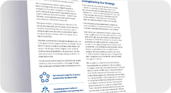 An Empowered, Agile and Accountable Organization We strive for an empowered, agile and accountable organization with little overlap or redundancy — flowing to new demands and seamlessly supporting each other, through a culture of equality and inclusion, to de liver against our priorities around the world. P&G is organized around five industry-based sector business units (SBUs). These five sectors manage our 10 product categories, with full sales, profit, cash and value creation responsibility for our largest and most profitable markets — called Focus Markets — accounting for about 80% of Company sales and about 90% of after-tax profit. Enterprise Markets, which represent the rest of the world, are a separate unit with sales, profit and value creation responsibility. Over the last several years, we have been growing both top and bottom line in nearly all of these markets, which are important to the future of P&G. The best proof that this organization design is working is the growth of our largest and most profitable market, North America, whose growth has accelerated since we put this design in place. Organic sales in North America have increased from an average of +2% the three years prior to the design change to +8% in the three years since. This structure, and its resulting organizational speed and focus, has also allowed us to manage through the challenges and headwinds we are experiencing. We continue to believe that this structure — with the SBUs squarely concentrated on Focus Markets and managing Enterprise Markets as a separate operating unit — is the best way to navigate successfully through the increasingly dynamic world in which we live. Operating through five industry- based Sector Business Units Prov iding greater clarity on responsibilities and reporting lines Strengthening leadership accountability Enabling P&G people to accelerate growth and value creation Strengthening Our Strategy One of the most important things about our strategy — portfolio, superiority, productivity, constructive disruption, and an empowered, agile and accountable organization — is that it is inherently dynamic, not static. It requires being responsive to changing consumer needs and habits. It demands we serve evolving customer needs in rapidly transforming channels. Going forward, we have identified four areas to be even more deliberate and intentional about pursuing to further strengthen the execution of our strategy. The first is Supply. We are improving our supply chain capacity, agility, cost efficiency and resilience for a new reality and a new age. The capability investments we made prior to COVID-19 to improve our manufacturing and distribution networks in the U.S. and Europe helped us to manage through the last few years with relatively few prolonged issues. We are already making the next round of investments needed to ensure we have multiple qualified suppliers for key inputs, sufficient manufacturing capacity to satisfy growing demand and flexibility to meet the changing needs of all types of retailers. The second area is Environmental Sustainability. We are integrating sustainability into our product, packaging and supply chain innovation work to develop irresistibly superior offerings for consumers that are better for the environment. For example, our new cardboard packaging on Gillette razors reduces plastic packaging and offers a noticeably superior experience for consumers at the first and second moments of truth. Another example is our new fully recyclable paper packaging on our premium Always Cotton Protection pads recently launched in Germany. One more example is cold-water washing with Tide and Ariel. When people turn their wash cycles to cold, they can save up to 90% of the energy used on every load of laundry, while saving money. They also get greater satisfaction because their colors look brighter, and their clothes look newer longer. Better for the consumer, better for our planet. Third, we are increasing our Digital Acumen to drive consumer and customer preference, reduce cost and enable rapid and efficient decision making. Increased vi • The Procter & Gamble Company