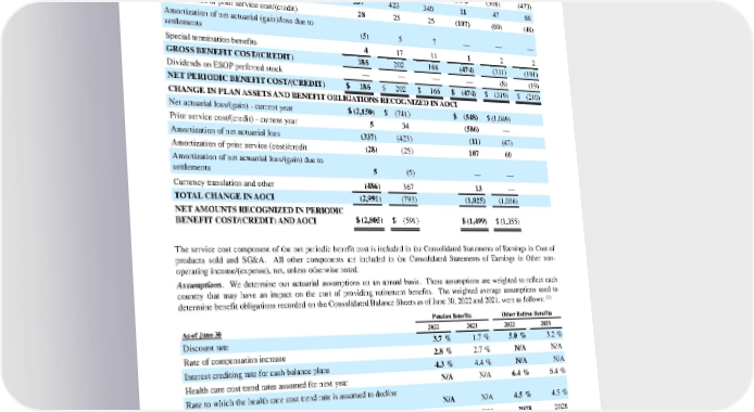 Net Periodic Benefit Cost . Components of the net periodic benefit cost were as follows: Pension Benefits Other Retiree Benefits Years ended June 30 2022 2021 2020 2022 2021 2020 AMOUNTS RECOGNIZED IN NET PERIODIC BENEFIT COST/(CREDIT) Service cost $ 253 $ 275 $ 247 $ 86 $ 94 $ 100 Interest cost 253 240 276 99 114 160 Expected return on plan assets (684) (783) (740) (564) (508) (473) Amortization of net actuarial loss 337 423 340 11 47 68 Amortization of prior service cost/(credit) 28 25 25 (107) (60) (48) Amortization of net actuarial (gain)/loss due to settlements (5) 5 7 — — — Special termination benefits 4 17 11 1 2 2 GROSS BENEFIT COST/(CREDIT) 186 202 166 (474) (311) (191) Dividends on ESOP preferred stock — — — — (8) (19) NET PERIODIC BENEFIT COST/(CREDIT) $ 186 $ 202 $ 166 $ (474) $ (319) $ (210) CHANGE IN PLAN ASSETS AND BENEFIT OBLIGATIONS RECOGNIZED IN AOCI Net actuarial loss/(gain) - current year $ (2,150) $ (741) $ (548) $ (1,049) Prior service cost/(credit) - current year 5 34 (586) — Amortization of net actuarial loss (337) (423) (11) (47) Amortization of prior service (cost)/credit (28) (25) 107 60 Amortization of net actuarial loss/(gain) due to settlements 5 (5) — — Currency translation and other (486) 367 13 — TOTAL CHANGE IN AOCI (2,991) (793) (1,025) (1,036) NET AMOUNTS RECOGNIZED IN PERIODIC BENEFIT COST/(CREDIT) AND AOCI $ (2,805) $ (591) $ (1,499) $ (1,355) The service cost component of the net periodic benefit cost is included in the Consolidated Stat ements of Earnings in Cost of products sold and SG&A. All other components are included in the Consolidated Statements of Earnings in Other non - operating income/(expense), net, unless otherwise noted. Assumptions . We determine our actuarial assumptions o n an annual basis. These assumptions are weighted to reflect each country that may have an impact on the cost of providing retirement benefits. The weighted average assumptions used to determine benefit obligations recorded on the Consolidated Balance Sh eets as of June 30, 2022 and 2021, were as follows: (1) Pension Benefits Other Retiree Benefits As of June 30 2022 2021 2022 2021 Discount rate 3.7 % 1.7 % 5.0 % 3.2 % Rate of compensation increase 2.8 % 2.7 % N/A N/A Interest crediting rate for cash balance plans 4.3 % 4.4 % N/A N/A Health care cost trend rates assumed for next year N/A N/A 6.4 % 6.4 % Rate to which the health care cost trend rate is assumed to decline (ultimate trend rate) N/A N/A 4.5 % 4.5 % Year that the rate reaches the ultimate trend rate N/A N/A 2028 2028 (1) Determined as of end of fiscal year. 54 The Procter & Gamble Company Amounts in millions of dollars except per share amounts or as otherwise specified.