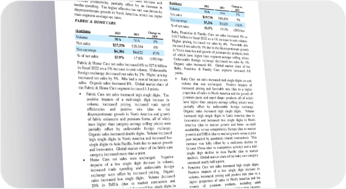 Net earnings increased 8% to $2.0 billion in fiscal 2022 due primarily to the increase in net sales. Net earnings margin decrea sed slightly as a decrease in gross margin and a higher effective tax rate were mostly offset by a decrease in SG&A as a percentage of net sales. The decrease in gross margin was driven primarily by increased commodity and transportation costs and other c ost increases associated with the global chip shortage, partially offset by increased pricing. SG&A as a percentage of net sales decreased due to the positive scale impacts of the net sales increase and overhead productivity, partially offset by an increa se in media spending. The higher effective tax rate was driven by disproportionate growth in North America, which has higher than segment - average tax rates. FABRIC & HOME CARE ($ millions) 2022 2021 Change vs. 2021 Volume N/A N/A 3% Net sales $27,556 $26,014 6% Net earnings $4,386 $4,622 (5)% % of net sales 15.9% 17.8% (190) bps Fabric & Home Care net sales increased 6% to $27.6 billion in fiscal 2022 on a 3% increase in unit volume. Unfavorable foreign exchange decreased net sales by 2%. Higher pricing increased net sales by 5%. Mix had a neutral impact to net sales. Organic sales increased 8%. Global market share of the Fabric & Home Care segment increased 1.5 points. • Fabric Care net sales increased high sin gle digits. The positive impacts of a mid - single digit increase in volume, increased pricing, increased trade spend efficiencies and positive mix (due to the disproportionate growth in North America and growth of fabric enhancers and premium forms, all of which have higher than category - average selling prices) were partially offset by unfavorable foreign exchange. Organic sales increased double digits. Volume increased high single digits in North America and increased low single digits in Asia Pacific, b oth due to market growth and innovation. Global market share of the fabric care category increased more than a point. • Home Care net sales were unchanged. Negative impacts of a low single digit decrease in volume, increased trade spending and unfavorable foreign exchange were offset by increased pricing. Organic sales increased low single digits. Volume decreased 20% in IMEA (due to market contraction and competitive activity) and decreased low single digits in North America (due to market co ntraction versus a prior year that benefited from pandemic - related consumption increases). Global market share of the home care category increased more than a point. Net earnings decreased 5% to $4.4 billion in fiscal 2022 as the increase in net sales was more than offset by a 190 basis - point reduction in net earnings margin. Net earnings margin decreased due primarily to a reduction in gross margin, partially offset by a reduction in SG&A as a percentage of net sales. The gross margin decrease was prima rily driven by an increase in commodity and transportation costs, and unfavorable mix caused by the growth of premium - priced, profit - accretive products that have lower than segment - average gross margins, partially offset by increased pricing. SG&A as a pe rcentage of net sales declined due to the positive scale benefits of the net sales increase and a reduction in marketing spending. BABY, FEMININE & FAMILY CARE ($ millions) 2022 2021 Change vs. 2021 Volume N/A N/A 1% Net sales $19,736 $18,850 5% Net earnings $3,266 $3,629 (10)% % of net sales 16.5% 19.3% (280) bps Baby, Feminine & Family Care net sales increased 5% to $19.7 billion in fiscal 2022 on a 1% increase in unit volume. Higher pricing increased net sales by 4%. Favorable mix increased net sales by 1% due to the disproportionate growth in North America and growth of premium tier products, both of which have higher than segment - average selling prices. Unfavorable foreign exchange decreased net sales by 1%. Organic sales increased 6%. Global market share of the Baby, Feminine & Family Care segment increase d 0.8 points. • Baby Care net sales increased mid - single digits on unit volume that was unchanged. Positive impacts of increased pricing and favorable mix (due to a higher proportion of sales in North America and the growth of premium pants and taped diape r products, all of which have higher than category - average selling prices) were partially offset by unfavorable foreign exchange. Organic sales increased high single digits. Volume increased high single digits in Latin America (due to innovation) and inc reased low single digits in North America (due to market growth and better on - shelf availability versus competitors), Europe (due to market growth) and IMEA (due to market growth versus a prior year impacted by pandemic - related contraction). This increase was fully offset by a mid - teens decline in Greater China (due to competitive activity) and a mid - single digit decline in Asia Pacific (due to market decline). Global market share of the baby care category increased nearly half a point. • Feminine Care net sales increased high single digits. Positive impacts of a low single digit increase in volume, increased pricing and positive mix (due to a higher proportion of sales in North America and the growth of premium products, including adult incontinence, b oth of which have higher than category - average selling prices) were partially offset by unfavorable foreign exchange. Organic sales increased double digits. The volume increase was driven by a high single digit increase in North America (due to innovatio n, distribution gains and market growth) partially offset by a low single digit decrease in IMEA (due to market decline). Market share of the feminine care category increased more than a point. The Procter & Gamble Company 23