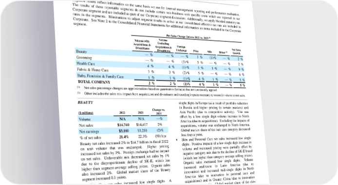 exchange impacts reduced net earnings by approximately $274 million in fiscal 2022 due to a weakening of certain currencies against the U.S. dollar. This impact includes both transactional charges and translational i mpacts from converting earnings from foreign subsidiaries to U.S. dollars. Net earnings attributable to Procter & Gamble increased $0.4 billion, or 3%, to $14.7 billion. Diluted net EPS increased $0.31, or 6%, to $5.81 due primarily to the increase in net earnings and, to a lesser extent, a reduction in shares outstanding. Net earnings per share increased 3% versus the prior year core EPS due to the prior year loss on early debt extinguishment. SEGMENT RESULTS Segment results reflect information on the same basis we use for internal management reporting and performance evaluation. The results of these reportable segments do not include certain non - business unit specific costs which are reported in our Corporate segment and are included as part of our Corporate segment discussion. Additionally, we apply blended statutory tax rates in the segments. Eliminations to adjust segment results to arrive at our consolidated effective tax rate are included in Corporate. See Not e 2 to the Consolidated Financial Statements for additional information on items included in the Corporate segment. Net Sales Change Drivers 2022 vs. 2021 (1) Volume with Acquisitions & Divestitures Volume Excluding Acquisitions & Divestitures Foreign Exchange Price Mix Other (2) Net Sales Growth Beauty — % — % — % 3 % (1) % — % 2 % Grooming — % — % (3) % 5 % — % — % 2 % Health Care 4 % 4 % (1) % 3 % 3 % — % 9 % Fabric & Home Care 3 % 3 % (2) % 5 % — % — % 6 % Baby, Feminine & Family Care 1 % 1 % (1) % 4 % 1 % — % 5 % TOTAL COMPANY 2 % 2 % (2) % 4 % 1 % — % 5 % (1) Net sales percentage changes are approximations based on quantitative formulas that are consistently applied. (2) Other includes the sales mix impact from acquisitions and divestitures and rounding impacts necessary to reconcile volume to net sales. BEAUTY ($ millions) 2022 2021 Change vs. 2021 Volume N/A N/A — % Net sales $14,740 $14,417 2% Net earnings $3,160 $3,210 (2)% % of net sales 21.4% 22.3% (90) bps Beauty net sales increased 2% to $14.7 billion in fiscal 2022 on unit volume that was unchanged. Higher pricing increased net sales by 3%. Foreign exchange had no impact on net sales. Unfavorable mix decreased net sales by 1% due to the disproportionate decline of SK - II, which has higher than segment - average selling prices. Organic sales also increased 2%. Global market share of the Beauty segment increased 0.1 points. • Hair Care net sales increased low single digits. A negative impact of a low single digit decrease in volume was more than offset by increased pricing and favorable mix (due to a higher proportion of premium products, which have higher than category - average selling prices). Organic sales also increased low single digits. Volume decreas ed mid - single digits in Greater China (due to pandemic - related lockdowns and market slowdown in traditional retailers where our shares are disproportionately higher versus social commerce) and IMEA (due to competitive activity) and decreased low single dig its in Europe (as a result of portfolio reduction in Russia and higher pricing in certain markets) and Asia Pacific (due to competitive activity). This was offset by a low single digit volume increase in North America (due to acquisitions). Excluding the impacts of acquisitions, volume was unchanged in North America. Global market share of the hair care category decreased less than a point. • Skin and Personal Care net sales increased low single digits. Positive impacts of a low single digit increase in volume and increased pricing were partially offset by negative category mix due to the decline of SK - II brand (which has higher than category - average selling prices). Organic sales increased low single digits. Volume increased mid - teens in La tin America (due to innovation) and increased mid - single digits in North America (due to innovation in personal care and acquisitions) and in Greater China (due to innovation and market growth). Global market share of the skin and personal care category i ncreased half a point. Net earnings decreased 2% to $3.2 billion in fiscal 2022 as the increase in net sales was more than offset by a 90 basis - point decrease in net earnings margin. Net earnings margin decreased due primarily to a reduction in gross marg in, partially offset by a reduction in SG&A as a percentage of sales. The gross margin reduction was driven by increased commodity and transportation costs and negative product mix caused by the decline of SK - II (which has higher than The Procter & Gamble Company 21