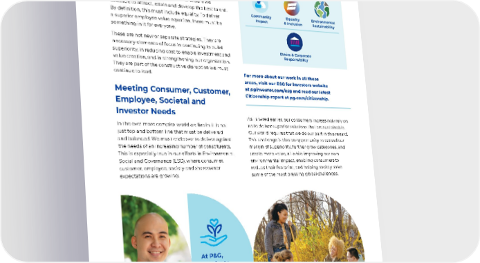 digitization of our manufacturing lines, more use of artificial intelligence and more use of blockchain technology are not ends unto themselves. They are tools we can use to delight consumers and customers. Fourth, a Superior Employee Value Equation for all gender identities, races, ethnicities, sexual orientations, ages, and abilities — for all roles — to ensure we continue to attract, retain and develop the best talent. By definition, this must include equality. To deliver a superior employee value equation, there must be something in it for everyone. These are not new or separate strategies. They are necessary elements of focus in continuing to build superiority, in reducing cost to enable investment and value creation, and in strengthening our organization. They are part of the constructive disruption we must continue to lead. Meeting Consumer, Customer, Employee, Societal and Investor Needs In the ever more complex world we live in, it is not just top and bottom line that must be delivered and balanced. We must endeavor to deliver against the needs of an increasing number of constituents. This is especially true in our efforts in Environmental, Social and Governance (ESG), where consumer, customer, employee, society and shareowner expectations are growing. As I shared earlier, our consumers increasingly rely on us to deliver superior solutions that are sustainable. Our world requires that we do our part in this regard. This challenge is also an opportunity to extend our margin of superiority, further grow categories, and create more value, all while improving our own environmental impact, enabling consumers to reduce their footprint, and helping society solve some of the most pressing global challenges. Citizenship Community Impact Equality & Inclusion Environmental Sustainability Ethics & Corporate Responsibility For more about our work in all these areas, visit our ESG for Investors website at pginvestor.com/esg and read our latest Citizenship report at pg.com/citizenship . At P&G, we aim to be a force for growth and a force for good. The Procter & Gamble Company • vii