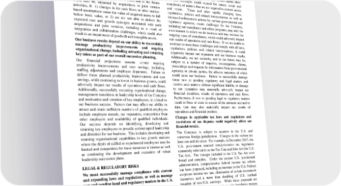 As a company that manages a portfolio of consumer brands, our ongoing business model includes a certain level of acquisition, j oint venture and divestiture activities. We must be able to successfully manage the impacts of these activities, while at the same time delivering against our business objectives. Specifically, our financial results have been, and in the future could be, adversely impacted by the dilutive impacts from the loss of earnings associated with divested brands or dissolution of joint ventures. Our results of operations and cash flows have been, and in the future could also be, impacted by acquisitions or joint venture activities, if: 1) changes in the cash flows or other market - based assumptions cause the value of acquired assets to fall below book value, or 2) we are not able to deliver the expected cost and growth synergies associated with such acquisitions and joint ventures, including as a result of integration and collaboration challenges, which could also result in an impairment of goodwill and intangible assets. Our business results depend on our ability to successfully manage productivity improvements a nd ongoing organizational change, including attracting and retaining key talent as part of our overall succession planning. Our financial projections assume certain ongoing productivity improvements and cost savings, including staffing adjustments and empl oyee departures. Failure to deliver these planned productivity improvements and cost savings, while continuing to invest in business growth, could adversely impact our results of operations and cash flows. Additionally, successfully executing organizatio nal change, management transitions at leadership levels of the Company and motivation and retention of key employees, is critical to our business success. Factors that may affect our ability to attract and retain sufficient numbers of qualified employees include employee morale, our reputation, competition from other employers and availability of qualified individuals. Our success depends on identifying, developing and retaining key employees to provide uninterrupted leadership and direction for our busin ess. This includes developing and retaining organizational capabilities in key growth markets where the depth of skilled or experienced employees may be limited and competition for these resources is intense as well as continuing the development and execu tion of robust leadership succession plans. LEGAL & REGULATORY RISKS We must successfully manage compliance with current and expanding laws and regulations, as well as manage new and pending legal and regulatory matters in the U.S. and abroad. Our business is subject to a wide variety of laws and regulations across the countries in which we do business, including those laws and regulations involving intellectual property, product liability, product composition or formulation, packaging content o r corporate responsibility after consumer purchase, marketing, antitrust and competition, privacy, data protection, environmental (including increasing focus on the climate, water and waste impacts of consumer packaged goods companies' operations and produ cts), employment, healthcare, anti - bribery, anti - corruption, trade (including tariffs, sanctions and export controls), tax, accounting and financial reporting or other matters. In addition, increasing governmental and societal attention to environmental, social and governance (ESG) matters, including expanding mandatory and voluntary reporting, diligence and disclosure on topics such as climate change, waste production, water usage, human capital, labor and risk oversight, could expand the nature, scope an d complexity of matters that we are required to control, assess and report. These and other rapidly changing laws, regulations, policies and related interpretations as well as increased enforcement actions by various governmental and regulatory agencies, create challenges for the Company, including our compliance and ethics programs, may alter the environment in which we do business and may increase the ongoing costs of compliance, which could adversely impact our results of operations and cash flows. If we are unable to continue to meet these challenges and comply with all laws, regulations, policies and related interpretations, it could negatively impact our reputation and our business results. Additionally, we are currently, and in the future may be, s ubject to a number of inquiries, investigations, claims, proceedings and requests for information from governmental agencies or private parties, the adverse outcomes of which could harm our business. Failure to successfully manage these new or pending reg ulatory and legal matters and resolve such matters without significant liability or damage to our reputation may materially adversely impact our financial condition, results of operations and cash flows. Furthermore, if new or pending legal or regulatory matters result in fines or costs in excess of the amounts accrued to date, that may also materially impact our results of operations and financial position. Changes in applicable tax laws and regulations and resolutions of tax disputes could negatively aff ect our financial results. The Company is subject to taxation in the U.S. and numerous foreign jurisdictions. Changes in the various tax laws can and do occur. For example, in December 2017, the U.S. government enacted comprehensive tax legislation commonly referred to as the Tax Cuts and Jobs Act (the U.S. Tax Act). The changes included in the U.S. Tax Act were broad and complex. Under the current U.S. presidential administration, comprehensive federal income tax reform has been proposed, including an increase in the U.S. Federa l corporate income tax rate, elimination of certain investment incentives and a more than doubling of U.S. residual taxation of non - U.S. earnings. While these proposals are controversial, likely to change during the legislati