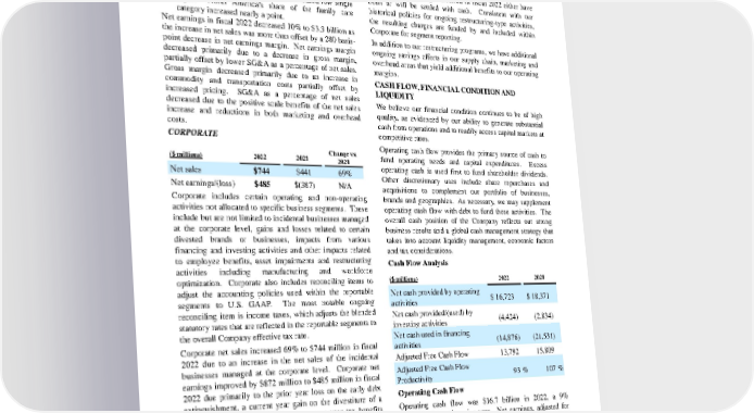 • Net sales in Family Care, which is predominantly a North Amer ican business, increased low single digits. Positive impacts of a low single digit increase in volume (due to increased promotional activity and innovation) and increased pricing were partially offset by increased promotional spending (versus the prior ye ar with low promotional activity due to the pandemic) and unfavorable mix (due to disproportionate growth in the club channel, which have lower than category - average selling prices). Organic sales also increased low single digits. North America's share o f the family care category increased nearly a point. Net earnings in fiscal 2022 decreased 10% to $3.3 billion as the increase in net sales was more than offset by a 280 basis - point decrease in net earnings margin. Net earnings margin decreased primarily due to a decrease in gross margin, partially offset by lower SG&A as a percentage of net sales. Gross margin decreased primarily due to an increase in commodity and transportation costs partially offset by increased pricing. SG&A as a percentage of net s ales decreased due to the positive scale benefits of the net sales increase and reductions in both marketing and overhead costs. CORPORATE ($ millions) 2022 2021 Change vs. 2021 Net sales $744 $441 69% Net earnings/(loss) $485 $(387) N/A Corporate includes certain operating and non - operating activities not allocated to specific business segments. These include but are not limited to incidental businesses managed at the corporate level, gains and losses related to certain divested brands or businesses, impacts from various financing and investing activities and other impacts related to employee benefits, asset impairments and restructuring activities including manufacturi ng and workforce optimization. Corporate also includes reconciling items to adjust the accounting policies used within the reportable segments to U.S. GAAP. The most notable ongoing reconciling item is income taxes, which adjusts the blended statutory ra tes that are reflected in the reportable segments to the overall Company effective tax rate. Corporate net sales increased 69% to $744 million in fiscal 2022 due to an increase in the net sales of the incidental businesses managed at the corporate level. Corporate net earnings improved by $872 million to $485 million in fiscal 2022 due primarily to the prior year loss on the early debt extinguishment, a current year gain on the divestiture of a minor business, net sales growth, current year tax benefits (primarily higher excess tax benefits of share - based compensation) and lower restructuring char ges, partially offset by increased commodity costs tied to the aforementioned incidental businesses. Restructuring Program to Deliver Productivity and Cost Savings The Company has historically had an ongoing restructuring program with annual spending in the range of $250 to $500 million. Savings generated from the Company's restructuring program are difficult to estimate, given the nature of the activities, the timi ng of the execution and the degree of reinvestment. In fiscal 2022, the Company incurred before tax restructuring costs within the range of our historical annual ongoing level of $250 to $500 million. Restructuring accruals of $147 million as of June 30, 2022, are classified as current liabilities. Approximately 65% of the restructuring charges incurred in fiscal 2022 either have been or will be settled with cash. Consistent with our historical policies for ongoing restructuring - type activities, the resu lting charges are funded by and included within Corporate for segment reporting. In addition to our restructuring programs, we have additional ongoing savings efforts in our supply chain, marketing and overhead areas that yield additional benefits to our o perating margins. CASH FLOW, FINANCIAL CONDITION AND LIQUIDITY We believe our financial condition continues to be of high quality, as evidenced by our ability to generate substantial cash from operations and to readily access capital markets at competitive rates. Operating cash flow provides the primary source of cash to fund operating needs and capital expenditures. Excess operating cash is used first to fund shareholder dividends. Other discretionary uses include share repurchases and acquisitions to co mplement our portfolio of businesses, brands and geographies. As necessary, we may supplement operating cash flow with debt to fund these activities. The overall cash position of the Company reflects our strong business results and a global cash manageme nt strategy that takes into account liquidity management, economic factors and tax considerations. Cash Flow Analysis ($ millions) 2022 2021 Net cash provided by operating activities $ 16,723 $ 18,371 Net cash provided/(used) by investing activities (4,424) (2,834) Net cash used in financing activities (14,876) (21,531) Adjusted Free Cash Flow 13,792 15,809 Adjusted Free Cash Flow Productivity 93 % 107 % Operating Cash Flow Operating cash flow was $16.7 billion in 2022, a 9% decrease versus the prior year. Net earnings, adjusted for non - cash items (depreciation and amortization, share - based compensation, deferred income taxes and gain on sale of assets) generated approximately $17.6 billion of operating cash flow. Working capital and other impacts used $918 million of operating cash flow as summarized below. • An increase in accounts receivable used $694 million of cash primarily due to sales growth. The number of days 24 The Procter & Gamble Company