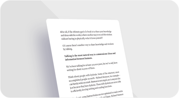 After all, if the ultimate goal of a book is to share your knowledge and ideas with the world, is there another way to record this wisdom without having to physically write it down yourself? Of course there’s another way to share knowledge and wisdom: by talking. Talking is the most natural way to communicate ideas and information between humans. We’ve been talking for at least 150,000 years, but we’ve only been writing for about 10,000 of those. Think about people with dyslexia. Some of the smartest, most accomplished people on earth—Richard Branson, for example— can barely write an email. Branson is not stupid, nor is anyone else just because they have dyslexia. Those with dyslexia are never able to efficiently develop writing and reading functions. Simply put, some human brains are not optimized to read or write text, but we are all optimized to talk and listen. Richard Branson can’t write, but he can absolutely talk. In fact, most of human knowledge throughout antiquity was shared and recorded through oral history. For most people, talking is easier than writing, but that still leaves the work of turning the talking into a book. Is there a way for a person to talk about their wisdom and ideas, instead of writing them down, and use that talking as the basis for the book? Yes, of course there is, and people have been leveraging this method throughout history. Here’s a very short list of people whose words still move the world, yet they never wrote anything down: • Socrates never wrote anything down, Plato recorded his words. hOW TO WriTE yOUr firST DrAfT (ThE SCriBE METhOD) · 151