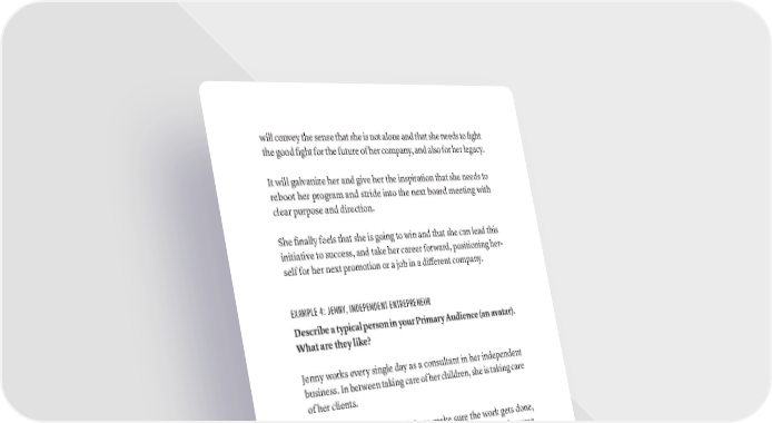 will convey the sense that she is not alone and that she needs to fight the good fight for the future of her company, and also for her legacy. It will galvanize her and give her the inspiration that she needs to reboot her program and stride into the next board meeting with clear purpose and direction. She finally feels that she is going to win and that she can lead this initiative to success, and take her career forward, positioning her- self for her next promotion or a job in a different company. EXAMPLE 4: JENNY, INDEPENDENT ENTREPRENEUR Describe a typical person in your Primary Audience (an avatar). What are they like? Jenny works every single day as a consultant in her independent business. In between taking care of her children, she is taking care of her clients. She is staying up late at night to make sure the work gets done, waking up exhausted each morning, and can’t seem to increase her income no matter what she does. When something happens in the family, she is the only one holding it all together. She feels guilty because she loves her business and she loves her children and her husband, but two always seem to suffer when she spends time with the other. She feels like she not only can’t get ahead, she can’t even get balanced. What pain are they experiencing because they’ve not read your book? Nothing is working. She is frustrated, physically tired, she’s in the figUrE OUT yOUr AUDiENCE · 81