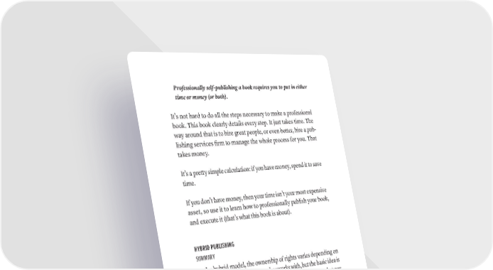 Professionally self-publishing a book requires you to put in either time or money (or both). It’s not hard to do all the steps necessary to make a professional book. This book clearly details every step. It just takes time. The way around that is to hire great people, or even better, hire a pub- lishing services firm to manage the whole process for you. That takes money. It’s a pretty simple calculation: if you have money, spend it to save time. If you don’t have money, then your time isn’t your most expensive asset, so use it to learn how to professionally publish your book, and execute it (that’s what this book is about). HYBRID PUBLISHING SUMMARY In the hybrid model, the ownership of rights varies depending on the publishing company the author works with, but the basic idea is that they try to look like a traditional publishing company, but pay little to no advance, yet still take most of the royalties, still control a lot of the process, and still do some part of the publishing work. OWNERSHIP AND RIGHTS Variable ROYALTY RATE Variable, usually 15-25 percent, but can be as high as 50 percent ADVANCE Usually not, but sometimes very small hOW TO PiCk ThE righT BOOk PUBliShiNg OPTiON · 327