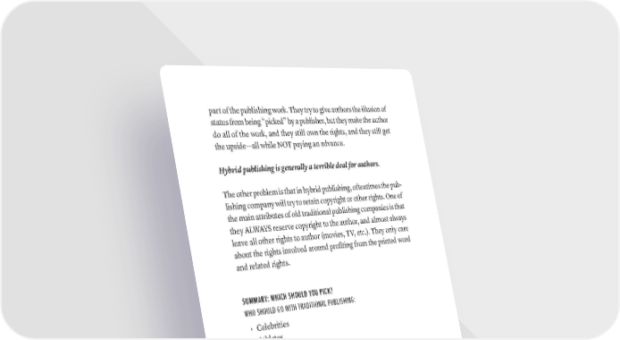 part of the publishing work. They try to give authors the illusion of status from being “picked” by a publisher, but they make the author do all of the work, and they still own the rights, and they still get the upside—all while NOT paying an advance. Hybrid publishing is generally a terrible deal for authors. The other problem is that in hybrid publishing, oftentimes the pub- lishing company will try to retain copyright or other rights. One of the main attributes of old traditional publishing companies is that they ALWAYS reserve copyright to the author, and almost always leave all other rights to author (movies, TV, etc.). They only care about the rights involved around profiting from the printed word and related rights. SUMMARY: WHICH SHOULD YOU PICK? WHO SHOULD GO WITH TRADITIONAL PUBLISHING: • Celebrities • Athletes • Musicians • Actors • Politicians • Professional Writers (novelists, etc.) • Anyone who can get an advance of $500k or more WHO SHOULD GO WITH SELF-PUBLISHING: • Entrepreneurs • Businesspeople • Executives • Financial Planners • Lawyers • Doctors • Business Owners • Consultants hOW TO PiCk ThE righT BOOk PUBliShiNg OPTiON · 329