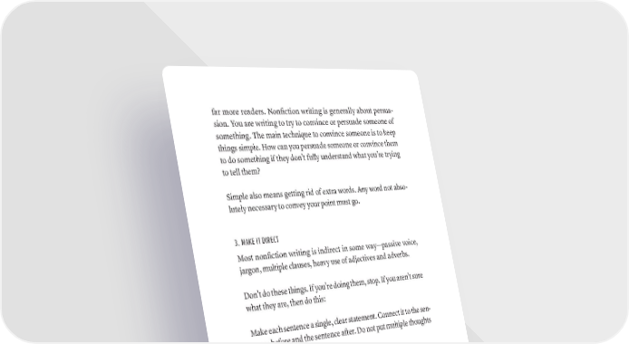 far more readers. Nonfiction writing is generally about persua- sion. You are writing to try to convince or persuade someone of something. The main technique to convince someone is to keep things simple. How can you persuade someone or convince them to do something if they don’t fully understand what you’re trying to tell them? Simple also means getting rid of extra words. Any word not abso- lutely necessary to convey your point must go. 3. MAKE IT DIRECT Most nonfiction writing is indirect in some way—passive voice, jargon, multiple clauses, heavy use of adjectives and adverbs. Don’t do these things. If you’re doing them, stop. If you aren’t sure what they are, then do this: Make each sentence a single, clear statement. Connect it to the sen- tence before and the sentence after. Do not put multiple thoughts in one sentence. Make your writing as direct as it can be. I have to explain passive and active voice, because most people don’t know what it is. Active voice means the subject of the sen- tence is performing the verb. Passive voice means the subject of the sentence receives the action. Even though they mean the same thing, the effect is very different. Example: Active: Tucker wrote the book. Passive: The book was written by Tucker. Active voice is much easier for people to read because they can picture the sentence. You can see Tucker writing a book. ThE SCriBE gUiDE TO WriTiNg EffECTivE NONfiCTiON · 135