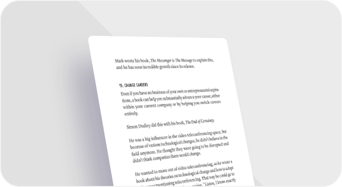 Mark wrote his book, The Messenger is The Message to explain this, and he has seen incredible growth since its release. 15. CHANGE CAREERS Even if you have no business of your own or entrepreneurial aspira- tions, a book can help you substantially advance your career, either within your current company or by helping you switch careers entirely. Simon Dudley did this with his book, The End of Certainty. He was a big influencer in the video teleconferencing space, but because of various technological changes, he didn’t believe in the field anymore. He thought they were going to be disrupted and didn’t think companies there would change. He wanted to move out of video teleconferencing, so he wrote a book about his theories on technological change and how to adapt to it, never mentioning teleconferencing. That way he could go to other businesses and pitch them, saying, “Listen, I know exactly how you’re being disrupted. I can help you.” He created a firm called Excession Events, and now he’s successful as a consultant on technological change. He essentially created a new career. Here’s the supreme irony: no one in the teleconferencing business listened to him before he wrote the book. Since he wrote it—and though he never mentioned teleconferencing in the book, the par- allels were obvious—half of his consulting business is made up of the firms in the teleconferencing business that wouldn’t hire him before. Jeb White is doing the same thing. He was a very successful lawyer, but it no longer served him, and he wanted a new profession. So 394 · ThE SCriBE METhOD
