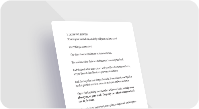3. LOCK IN YOUR BOOK IDEA What is your book about, and why will your audience care? Everything is connected. The objectives necessitate a certain audience. The audience has their needs that must be met by the book. And the book idea must attract and provide value to the audience, so you’ll reach the objectives you want to achieve. It all ties together in a simple formula. If you follow it, you’ll pick a book topic that provides value for both you and the audience. That’s the key thing to remember with your book: nobody cares about you, or your book. They only care about what your book can do for them. This point is so important, I am going to begin and end the piece with it: Positioning answers the question in your reader’s mind: “Why should I read this book?” If you do not know the answer to that question before you start writing, chances are you will write a book that does not serve an audience…or you. 56 · ThE SCriBE METhOD