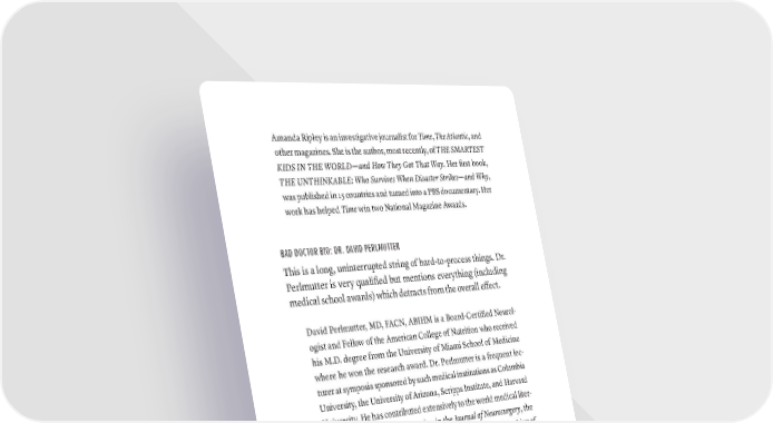 Amanda Ripley is an investigative journalist for Time, The Atlantic, and other magazines. She is the author, most recently, of THE SMARTEST KIDS IN THE WORLD—and How They Got That Way. Her first book, THE UNTHINKABLE: Who Survives When Disaster Strikes—and Why, was published in 15 countries and turned into a PBS documentary. Her work has helped Time win two National Magazine Awards. BAD DOCTOR BIO: DR. DAVID PERLMUTTER This is a long, uninterrupted string of hard-to-process things. Dr. Perlmutter is very qualified but mentions everything (including medical school awards) which detracts from the overall effect. David Perlmutter, MD, FACN, ABIHM is a Board-Certified Neurol- ogist and Fellow of the American College of Nutrition who received his M.D. degree from the University of Miami School of Medicine where he won the research award. Dr. Perlmutter is a frequent lec- turer at symposia sponsored by such medical institutions as Columbia University, the University of Arizona, Scripps Institute, and Harvard University. He has contributed extensively to the world medical liter- ature with publications appearing in the Journal of Neurosurgery, the Southern Medical Journal, Journal of Applied Nutrition, and Archives of Neurology. He is the author of: The Better Brain Book and the #1 New York Times Bestseller, Grain Brain. He is recognized internationally as a leader in the field of nutritional influences in neurological disorders. Dr. Perlmutter has been interviewed on many nationally syndicated radio and television programs including 20/20, Larry King Live, CNN, Fox News, Fox and Friends, The Today Show, Oprah, Dr. Oz, and The CBS Early Show. In 2002 Dr. Perlmutter was the recipient of the Linus Pauling Award for his innovative approaches to neurological disor- ders and in addition was awarded the Denham Harmon Award for his pioneering work in the application of free radical science to clinical medicine. He is the recipient of the 2006 National Nutritional Foods Association Clinician of the Year Award. Dr. Perlmutter serves as Med- ical Advisor for the Dr. Oz show. 260 · ThE SCriBE METhOD