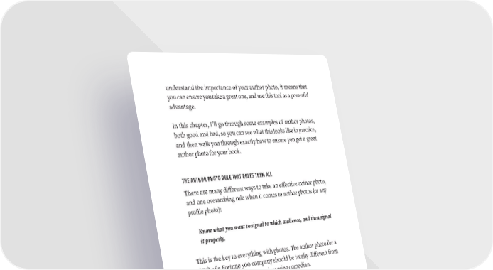 understand the importance of your author photo, it means that you can ensure you take a great one, and use this tool as a powerful advantage. In this chapter, I’ll go through some examples of author photos, both good and bad, so you can see what this looks like in practice, and then walk you through exactly how to ensure you get a great author photo for your book. THE AUTHOR PHOTO RULE THAT RULES THEM ALL There are many different ways to take an effective author photo, and one overarching rule when it comes to author photos (or any profile photo): Know what you want to signal to which audience, and then signal it properly. This is the key to everything with photos. The author photo for a CEO of a Fortune 500 company should be totally different from the author photo for an up-and-coming comedian. Why? Because they are signaling different things to different groups. Generally speaking, the CEO’s author photo should signal profes- sionalism, effectiveness, reliability, and trust. The comedian’s photo could be wacky, goofy, or even pensively serious, all depending on the comedic style they want to signal. To make sure you’re taking the right author photo, you need to ask yourself two questions: 1. WHAT AM I TRYING TO SIGNAL WITH MY PHOTO? You say just as much with your appearance as you do with your 268 · ThE SCriBE METhOD