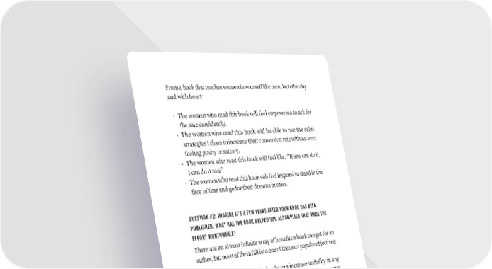 From a book that teaches women how to sell like men, but ethically and with heart: • The women who read this book will feel empowered to ask for the sale confidently. • The women who read this book will be able to use the sales strategies I share to increase their conversion rate without ever feeling pushy or sales-y. • The women who read this book will feel like, “If she can do it, I can do it too!” • The women who read this book will feel inspired to stand in the face of fear and go for their dreams in sales. QUESTION #2: IMAGINE IT’S A FEW YEARS AFTER YOUR BOOK HAS BEEN PUBLISHED. WHAT HAS THE BOOK HELPED YOU ACCOMPLISH THAT MADE THE EFFORT WORTHWHILE? There are an almost infinite array of benefits a book can get for an author, but most of them fall into one of these six popular objectives: 1. Raise Visibility/Profile: books can increase visibility in any number of ways, like making it easier to gain media exposure or raise your profile in your niche. 2. Increase Authority/Credibility: books help an author establish authority and gain credibility within their field. 3. Get New Clients/Opportunities: books can easily help gen- erate new business and other opportunities across a variety of platforms and venues in multiple ways. 4. Speaking Engagements: a book is almost a necessity for becoming a paid speaker, or often getting booked for any public speaking at all. 5. Leave a Legacy: a book can help establish a legacy, and pass your story on to others. 6. Impact Others: This is somewhat covered by the first question, but you can put it here as well. For some authors, this is often the main benefit to them. They either do not care about what figUrE OUT yOUr BOOk OBjECTivES · 59