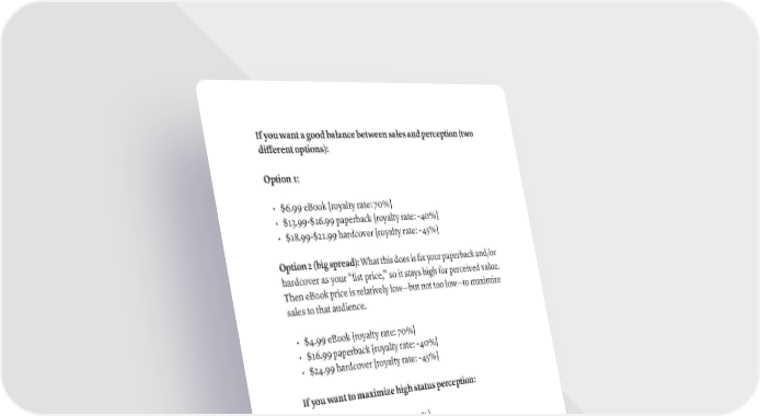 If you want a good balance between sales and perception (two different options): Option 1: • $6.99 eBook [royalty rate: 70%] • $13.99-$16.99 paperback [royalty rate: ~40%] • $18.99-$21.99 hardcover [royalty rate: ~45%] Option 2 (big spread): What this does is fix your paperback and/or hardcover as your “list price,” so it stays high for perceived value. Then eBook price is relatively low—but not too low—to maximize sales to that audience. • $4.99 eBook [royalty rate: 70%] • $16.99 paperback [royalty rate: ~40%] • $24.99 hardcover [royalty rate: ~45%] If you want to maximize high status perception: • $9.99 eBook [royalty rate: 70%] • $17.99-$19.99 paperback [royalty rate: ~40%] • $24.99-$27.99 hardcover [royalty rate: ~45%] 310 · ThE SCriBE METhOD