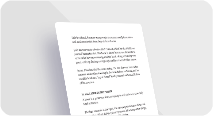 This is rational, because many people learn more easily from video and audio materials than they do from books. Josh Turner wrote a book called Connect, which hit the Wall Street Journal bestseller list. His book is about how to use LinkedIn to drive sales in your company, and the book, along with being very good, ends up driving many people to his advanced video course. Jason Fladlien did the same thing. He has the very best video courses and online training in the world about webinars, and he used his book as a “top of funnel” lead gen to sell millions of dollars of his courses. 14. SELL A SOFTWARE/SAAS PRODUCT A book is a great way for a company to sell software, especially SaaS software. The best example is HubSpot, the company that invented inbound marketing. What did they do to promote it? Among other things, they wrote a book called Inbound Marketing. The book minimally pitches HubSpot and is instead a massive - advertisement for their method of marketing (inbound market ing), and guess what? Using their software is the easiest way to actually do inbound mar- keting. Not only does the book provide real value to the reader, it ends up converting a lot of readers to customers. Another example is Mark Organ. His company, Influitive, helps companies and brands harness the power of their fans to create new “advocate marketing” channels. The software they have created to facilitate this is very powerful, but it often takes a mental leap for people to understand how “advocate marketing” really works. hOW TO MAkE MONEy WiTh yOUr BOOk · 393