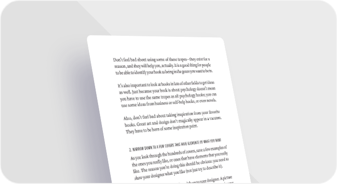 Don’t feel bad about using some of these tropes—they exist for a reason, and they will help you, actually. It is a good thing for people to be able to identify your book as being in the genre you want to be in. It’s also important to look at books in lots of other fields to get ideas as well. Just because your book is about psychology doesn’t mean you have to use the same tropes as all psychology books; you can use some ideas from business or self-help books, or even novels. Also, don’t feel bad about taking inspiration from your favorite books. Great art and design don’t magically appear in a vacuum. They have to be born of some inspiration point. 2. NARROW DOWN TO A FEW COVERS THAT HAVE ELEMENTS OF WHAT YOU WANT As you look through the hundreds of covers, save a few examples of the ones you really like, or ones that have elements that you really like. The reason you’re doing this should be obvious: you need to show your designer what you like (not just try to describe it). Save the links or images and send them to your designer. A picture is worth a thousand words, which is worth a massive savings in your time and money. Designers see the world visually, and the best way to get a point across to them is to show them. At Scribe, we have a document with ten very different covers that we walk authors through to get a sense for their taste; doing this is common practice. 3. PICK BRANDS OR OTHER PIECES OF ART THAT CAPTURE YOUR AESTHETIC Don’t just look at covers. Pull in logos, websites, art, photos, or pretty much any image you can find that’s in some way similar to what you want on your book cover. Remember that design is everywhere. Do you love the clean, light hOW TO gET A grEAT BOOk COvEr · 283