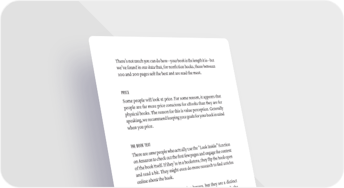 There’s not much you can do here—your book is the length it is—but we’ve found in our data that, for nonfiction books, those between 100 and 200 pages sell the best and are read the most. PRICE Some people will look at price. For some reason, it appears that people are far more price conscious for eBooks than they are for physical books. The reason for this is value perception. Generally speaking, we recommend keeping your goals for your book in mind when you price. THE BOOK TEXT There are some people who actually use the “Look Inside” function on Amazon to check out the first few pages and engage the content of the book itself. If they’re in a bookstore, they flip the book open and read a bit. They might even do more research to find articles online about the book. These are the high-information buyers, but they are a distinct minority. Probably fewer than 10 percent of your buyers do the thing that everyone says they want to do: judge a book by the con- tent inside, and not the cover. 448 · ThE SCriBE METhOD