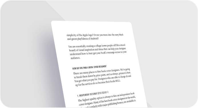simplicity of the Apple logo? Or are you more into the zany black and green playfulness of Android? You are essentially creating a collage (some people call this a mood board) of visual inspiration and ideas that can help your designer understand how to best get your book’s message across to your audience. HOW DO YOU FIND A BOOK COVER DESIGNER? There are many places to hire book cover designers. We’re going to break them down by price point, and as always, priciest is best. You get what you pay for. Designers who are able to charge 2k and up for the services do so because their books SELL. 1. INDEPENDENT DESIGNER ($750-$2000+): The highest quality option is always to hire an independent book cover designer. Many of the best book cover designers in the world, who work regularly with major publishing houses, are available to hire on a freelance basis. There are a few ways to find these people. One of the best options is Reedsy, a freelance marketplace designed specifically for authors. The other option is to go to more general design sites, like Behance or Dribbble, and search for book designers there. They can be a bit slow to respond and difficult to get in touch with, but the quality there is outstanding as well. But the best method is to look inside your favorite books and see who designed the cover. Then google their name—more than half the time, you’ll find their design site, and can contact them directly. 284 · ThE SCriBE METhOD