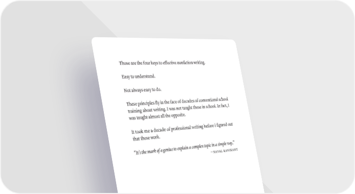 Those are the four keys to effective nonfiction writing. Easy to understand. Not always easy to do. These principles fly in the face of decades of conventional school training about writing. I was not taught these in school. In fact, I was taught almost all the opposite. It took me a decade of professional writing before I figured out that these work. “It’s the mark of a genius to explain a complex topic in a simple way.” —naval ravikant ThE SCriBE gUiDE TO WriTiNg EffECTivE NONfiCTiON · 137